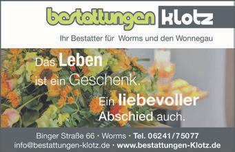 BiszurSchließungdesWochenmarktesabdem21.Dezember sindauchsämtlicheKuchenverkäufevergeben. VertreterderKiTaSonnenschein (20.September),derVereinfür Heimatgeschichteam27.September undderMGVHarmonieam4. Oktober.EskönnenReservierungen fürdenKuchenverkaufimJahr 2025abDienstag,1.Oktober,per Emailangewerbe@buerstadt.de vorgenommenwerden.DieVergabe erfolgtnachdemEingangder E-Mails,indenendiekonkreten Terminwünschegenanntwerden. IndenEmailssollteaucheineRufnummerfüreventuellauftretende Rückfragenaufgeführtsein.Nach einer„schöpferischenPause“wird damitgerechnet,dassderWochenmarktabMitteJanuar2025 öffnet. zg WarnstreikderÄrzte imKlinikumWorms WORMS–ImRahmenderderzeit laufendenTarifverhandlungenzwischenderVereinigungderkommunalenArbeitgeberverbände (VKA)unddemMarburgerBund fürÄrzteankommunalenKrankenhäusernhatderMarburger Bundfürden16.Septemberzu einembundesweitenganztägigen Warnstreikaufgerufen.Hiervonist auchdasKlinikumWormsbetroffen. DiePatientenversorgungistauch amStreiktagsichergestellt.Sowohl dieNotfallversorgungalsauchdie Durchführunglebensnotwendiger Operationenlaufenuneingeschränkt weiter.
