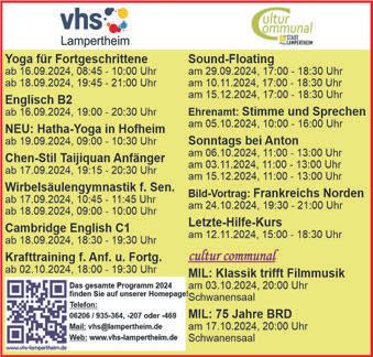 SeptemberüberdieHomepage derVHSLampertheim:www.vhslampertheim.demöglich.Das ProgrammzurBuchmessefindet manunterhttps://www.buchmesse.de/themen-programmund sicheinenTermin,beidemeine oderanderenLieblingsautoren sichern.TreffpunktzurAbfahrt am19.Oktoberistum8.45Uhr dasHausamRömervorder StadtbüchereiLampertheim.Die Teilnahmegebührvon18Euro beinhaltetdieFahrtundden EintrittzurBuchmesse.Infosgibt esunterTel.06206/935312.zg