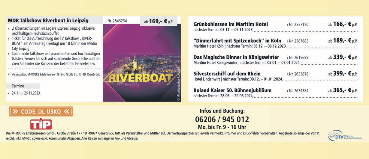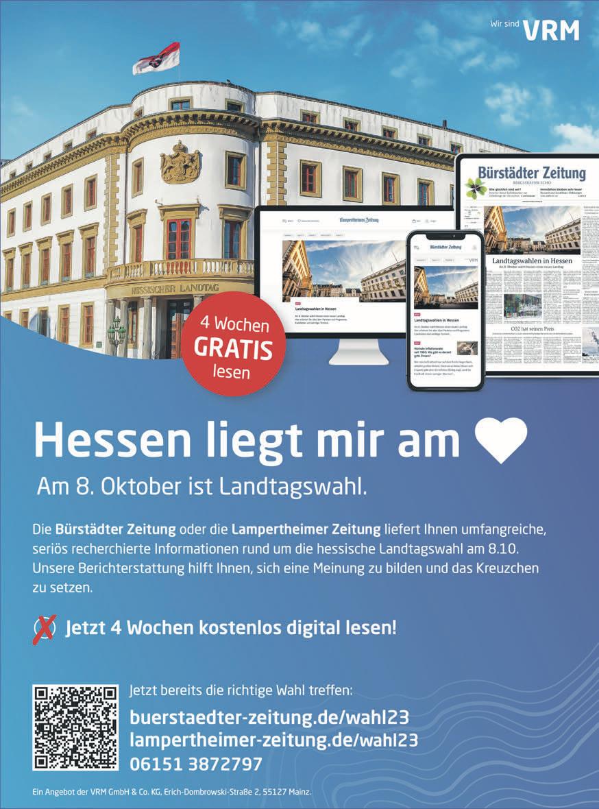 Schützenstraße50•68623Lampertheim•Tel.06206-94500•Fax06206-945010• www.tip-suedhessen.de info@tip-suedhessen.de Samstag,7.Oktober2023·KW40·47.Jahrgang SÜDHESSEN DIEGRATISZEITUNGFÜRDASRIED Unser Angebotgilt vom 2.bis28. Oktober 2023 mitbiszu 60 % WirbedankenunsfürIhreTreue! aufALLESwaswiranLagerhaben. JUWELIER&OPTIKGMBH KAISERSTRASSE5,68623LAMPERTHEIM BISCH@JUWELIER-BISCH.DE 06206/4231 WWW.JUWELIER-BISCH.DE ÖFFNUNGSZEITEN MO-FR:09:00-12:30/14:30-18:30 SAMSTAG:09:00-13:00