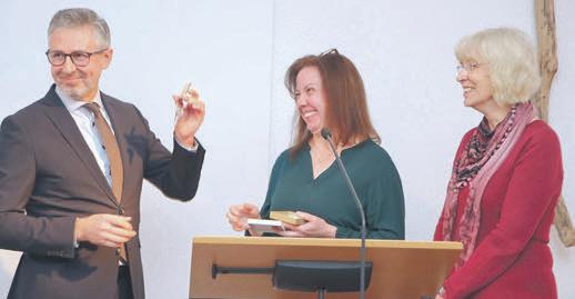 PastorMarianG.SilaghihältnunauchdenSchlüsselzurGemeindeinderHand,überreichtvonGemeindeleiterin AndreaZimmermann(Mitte).SüßeLampertheimerGrüßeinFormfeinerPralinenerhieltervonderstellvertretenden GemeindeleiterinHeikeUlrich.