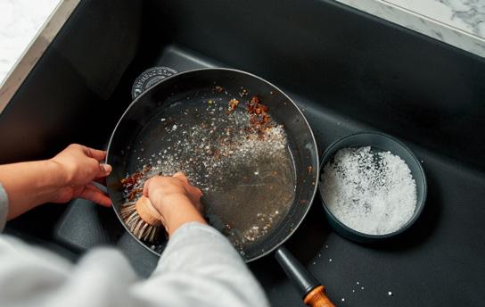 Som en særegen designeffekt er vaskens kanter i naturlig rustfritt stål. Det gir nedfellingsversjonen et karakteristisk utseende som matcher InFino avløpet som kommer rustfritt stål som standard. Ønskes en mindre kontrast kan man velge Dark Steel Edition for underliming. Her følger InFino kurvventil med farge dark steel. InFino kurvventil kan byttes ut til ønsket farge på alle modeller i etterkant. Se oversikt på side 65. NYHET