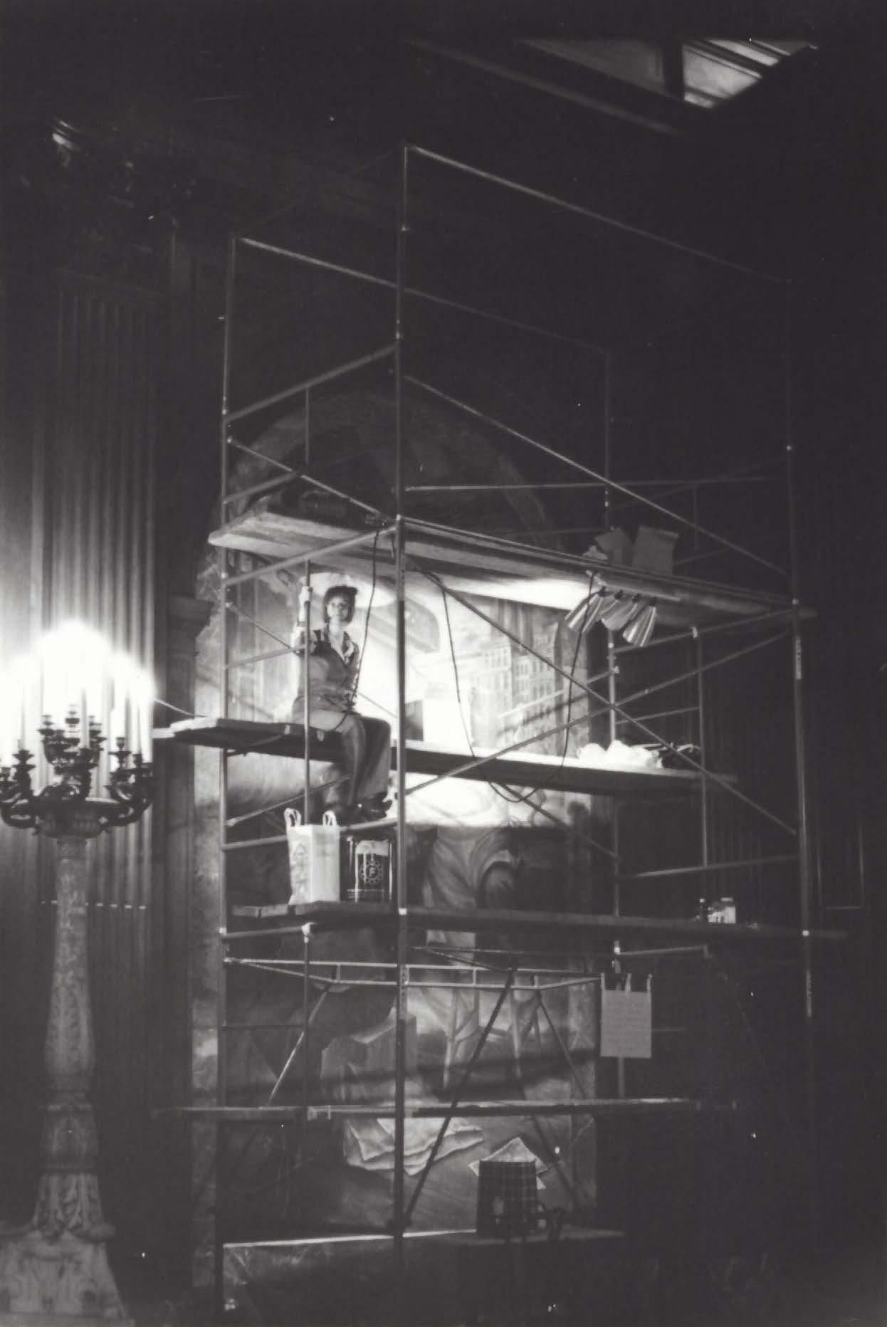 Left: Photograph of Joyce Hill Stoner on scaffolding while cleaning the 1938–1942 Edward Laning mural, The Story of the Recorded Word , in the New York Public Library, 1970’s. Foundation for Advancement in Conservation (FAIC) Oral History Collection . Winterthur Museum, Garden & Library, Winterthur, DE.