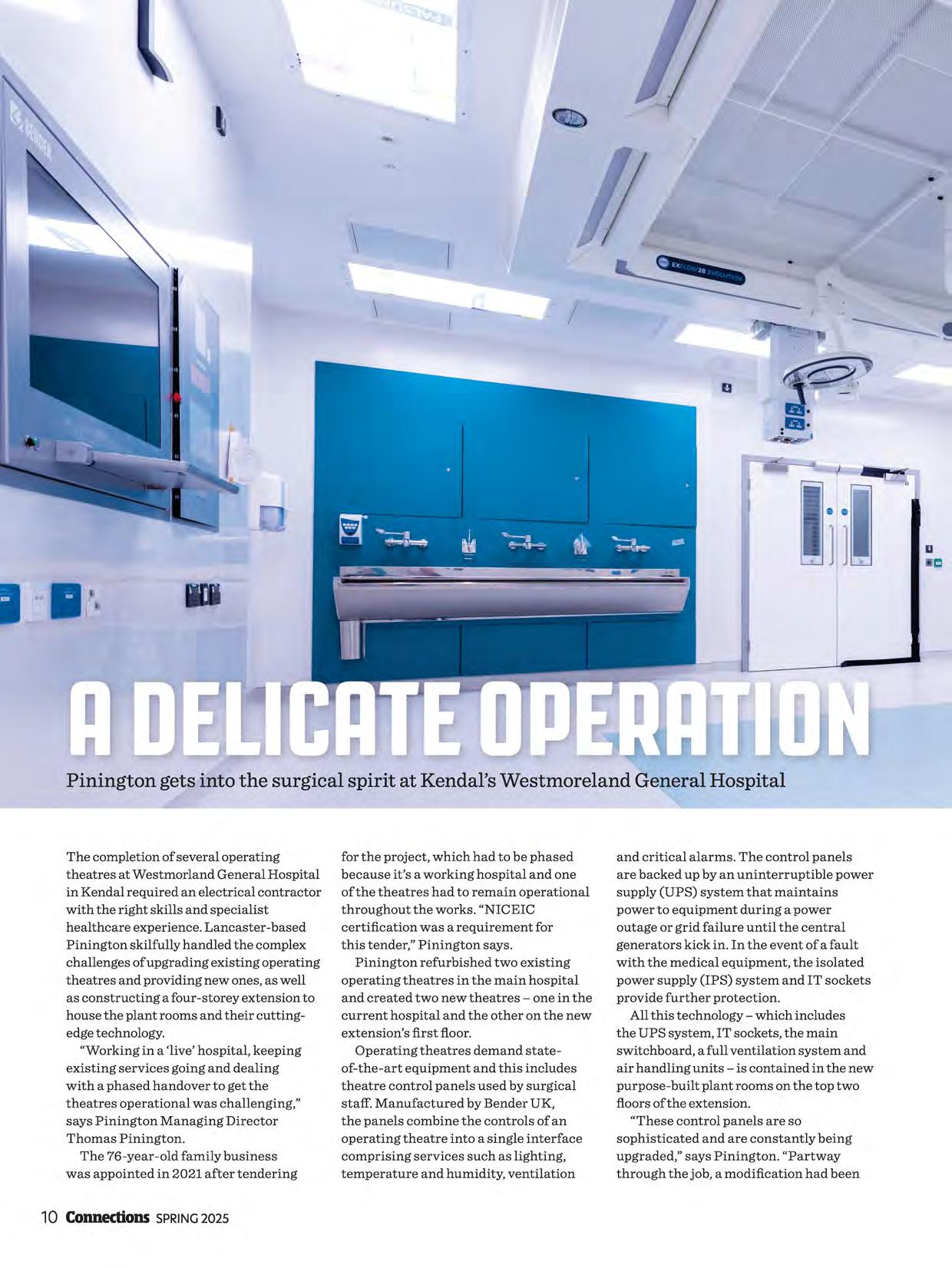 The completion of several operating theatres at Westmorland General Hospital in Kendal required an electrical contractor with the right skills and specialist healthcare experience. Lancaster-based Pinington skilfully handled the complex challenges of upgrading existing operating theatres and providing new ones, as well as constructing a four-storey extension to house the plant rooms and their cuttingedge technology.