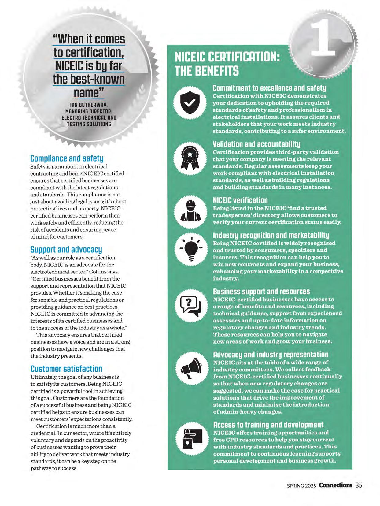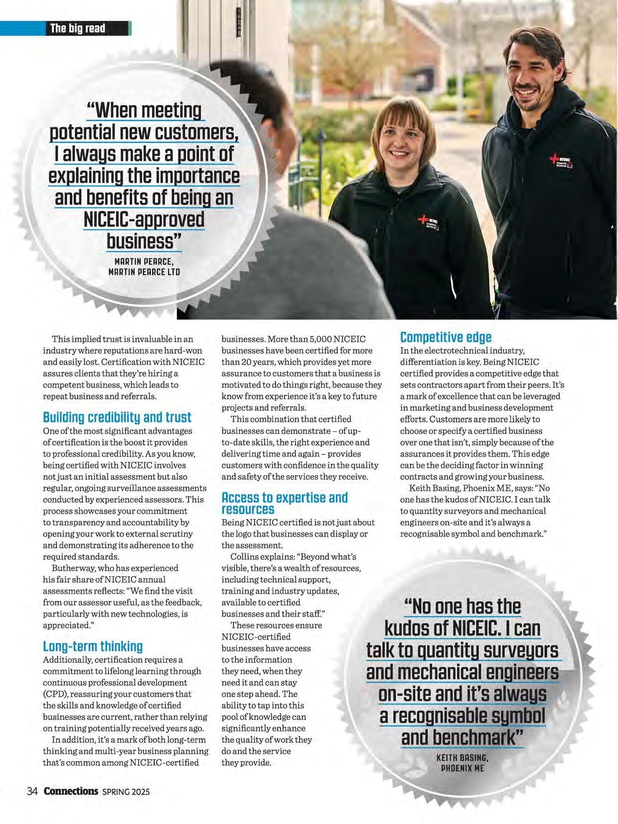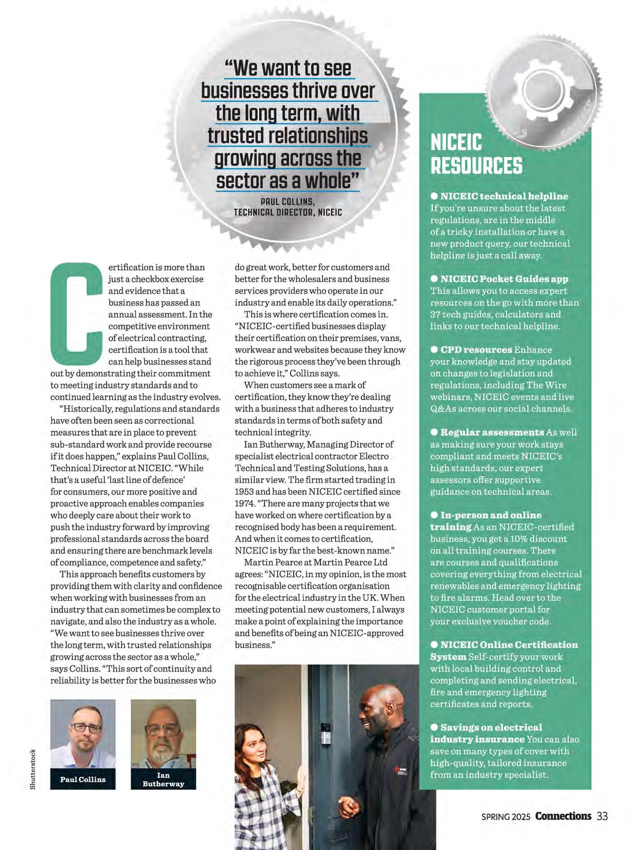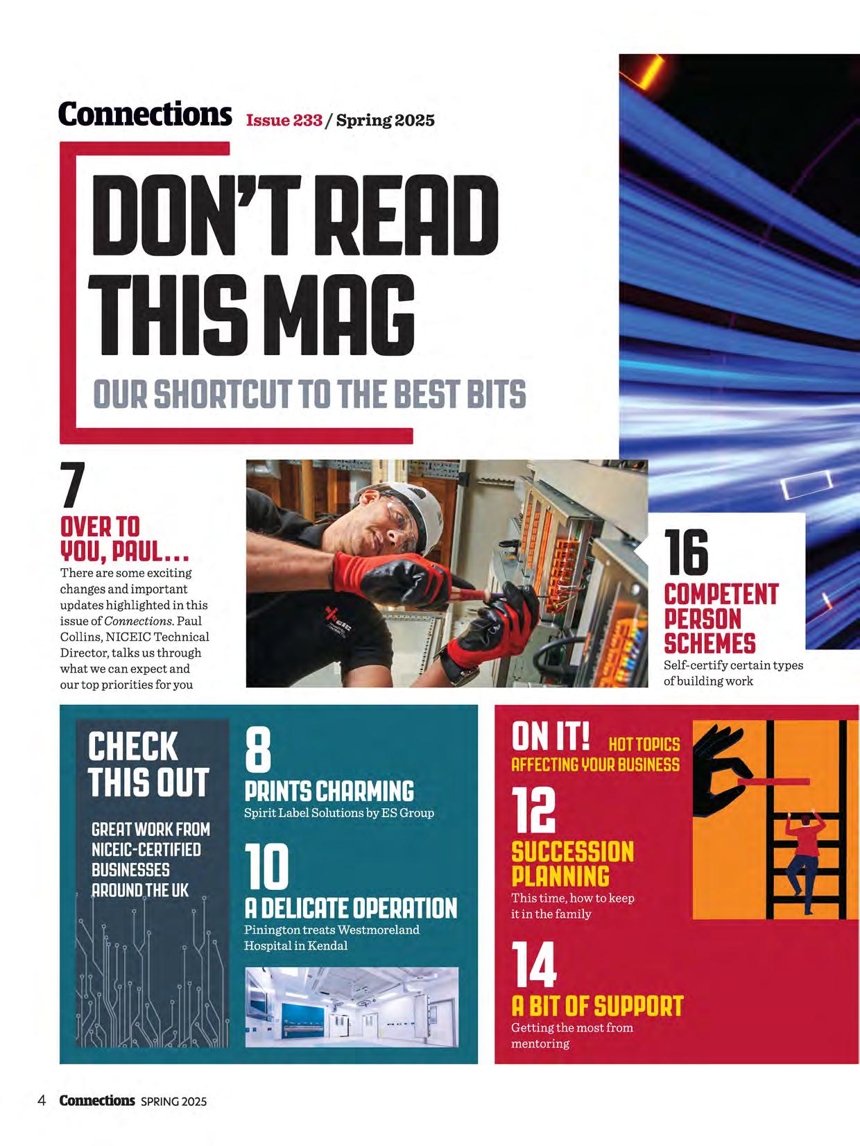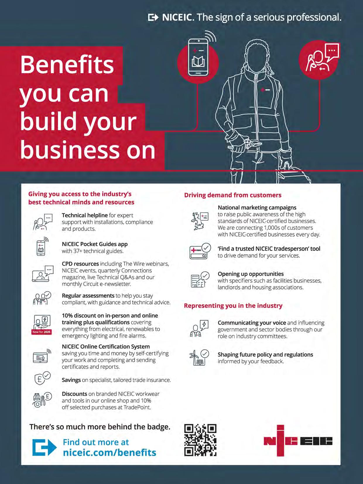 We're pleased to announce that NICEIC anniversary certificates are making a return (page 21). We're delighted to see the pride expressed by many certified businesses on reaching those milestones through your comments on social media. The anticipated update to BS 5839-1 has now been published and we've covered it on page 46. I know this article will be invaluable to those whose work is impacted by the changes. This issue's cover story (page 32) looks at what certification really signifies in the electrotechnical industry. Beyond the annual assessment and the visible markers of certification, the piece offers us all a helpful reminder of the unseen benefits of certification and how it can help the entire industry build trust and confidence. Looking to the future, we have an article on the importance of apprenticeships and a strong skills pipeline to the future of our industry (page 24). NICEIC conducted research, covered in the article, on some of the key challenges that certified businesses are facing when it comes to fresh talent and the mechanisms the industry needs to put in place to overcome them. I want to thank those of you who took time to share your views.
