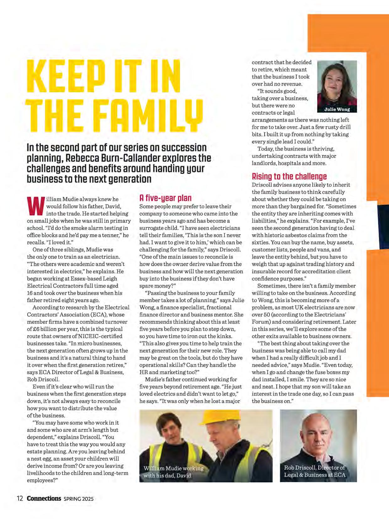According to research by the Electrical Contractors' Association (ECA), whose member firms have a combined turnover of £6 billion per year, this is the typical route that owners ofNICEIC-certified businesses take. "In micro businesses, the next generation often grows up in the business and it's a natural thing to hand it over when the first generation retires," says ECA Director of Legal & Business, Rob Driscoll.