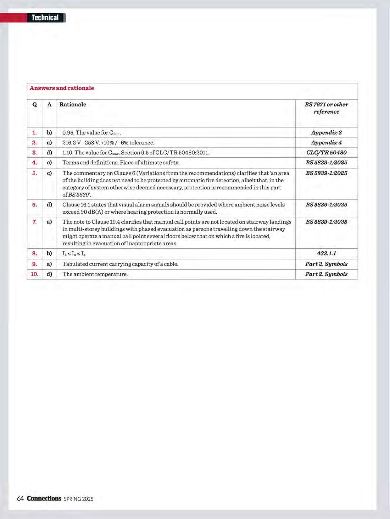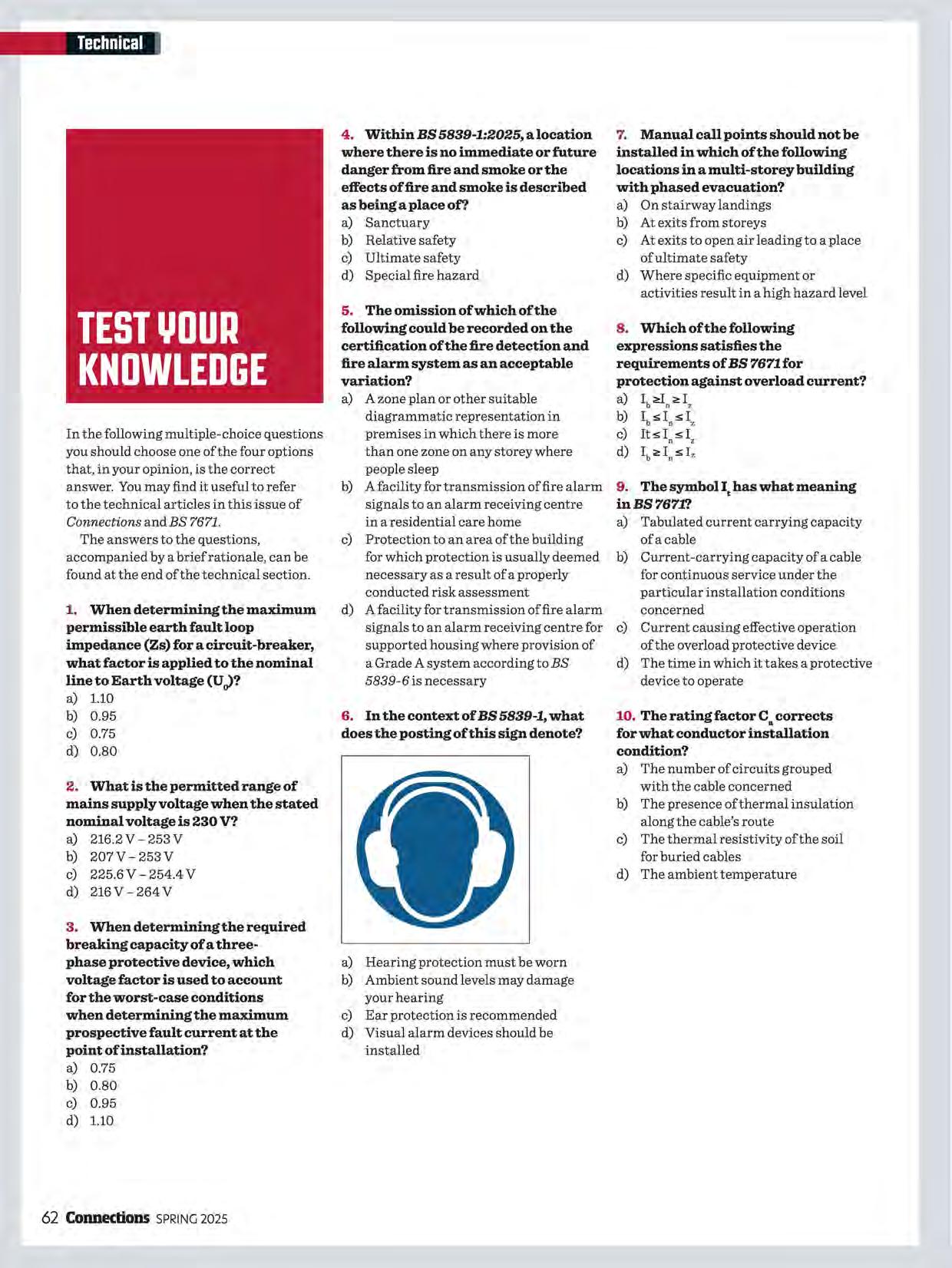 In the following multiple-choice questions you should choose one of the four options that, in your opinion, is the correct answer. You may find it useful to refer to the technical articles in this issue of Connections and BS 7671. The answers to the questions, accompanied by a briefrationale, can be found at the end of the technical section.