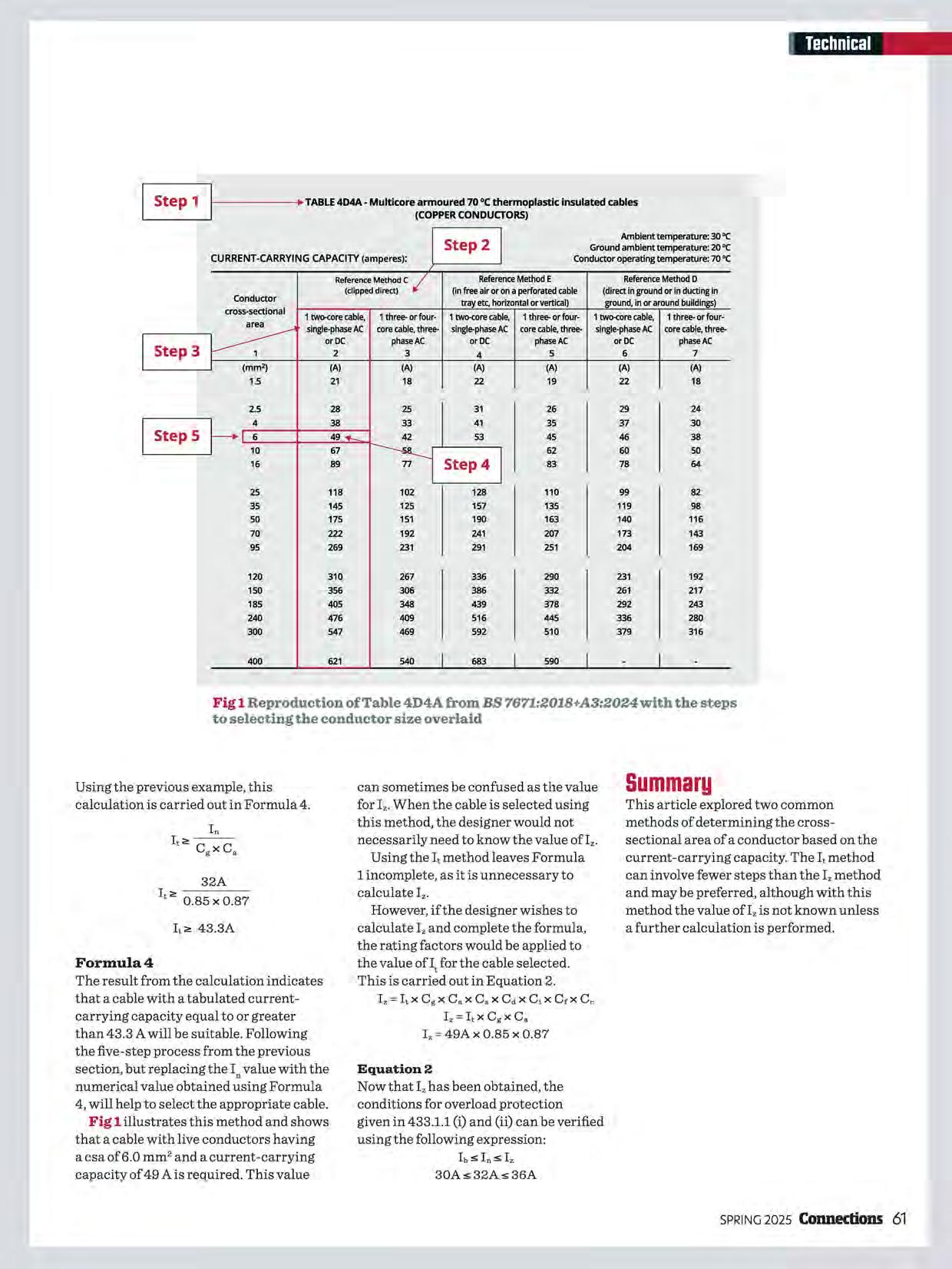 Fig 1 Reproduction of Table 4D4A from BS 7671:201B+A3:2024with the steps to selecting the conductor size overlaid