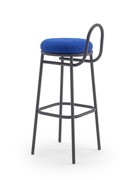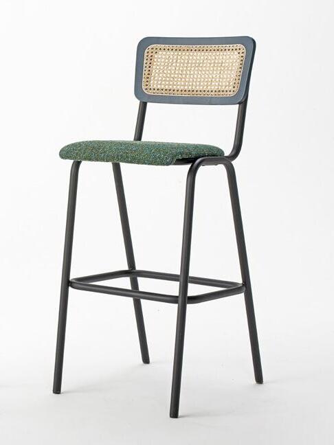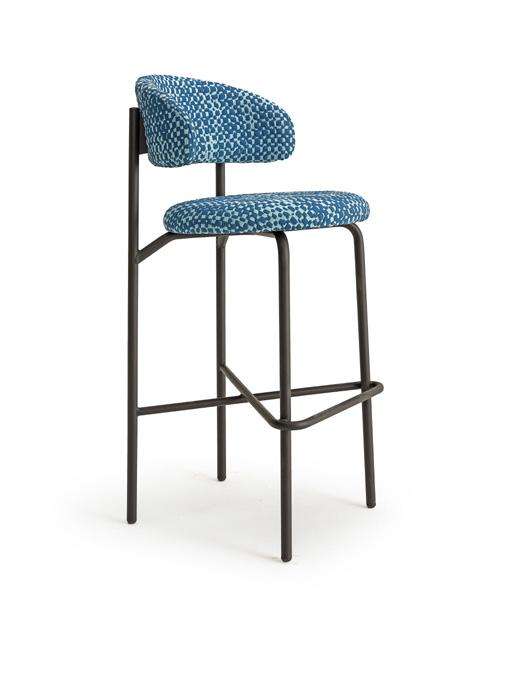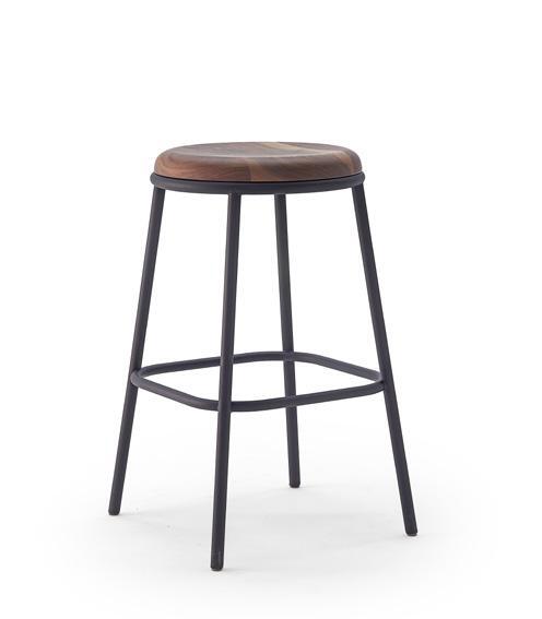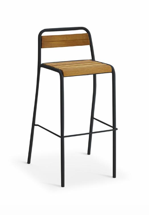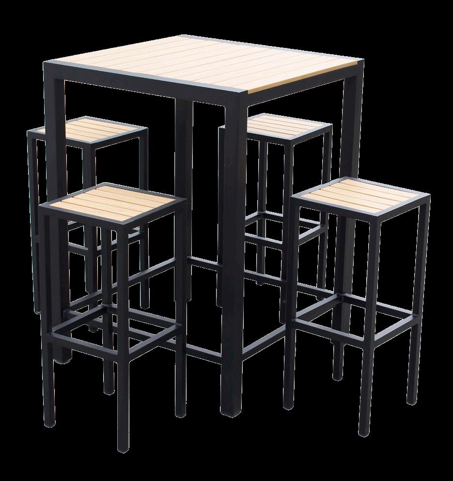 Barsett i sortlakkert aluminium og polywood i teakfinish. Barkrakkene kan settes under bordet når de ikke er i bruk.