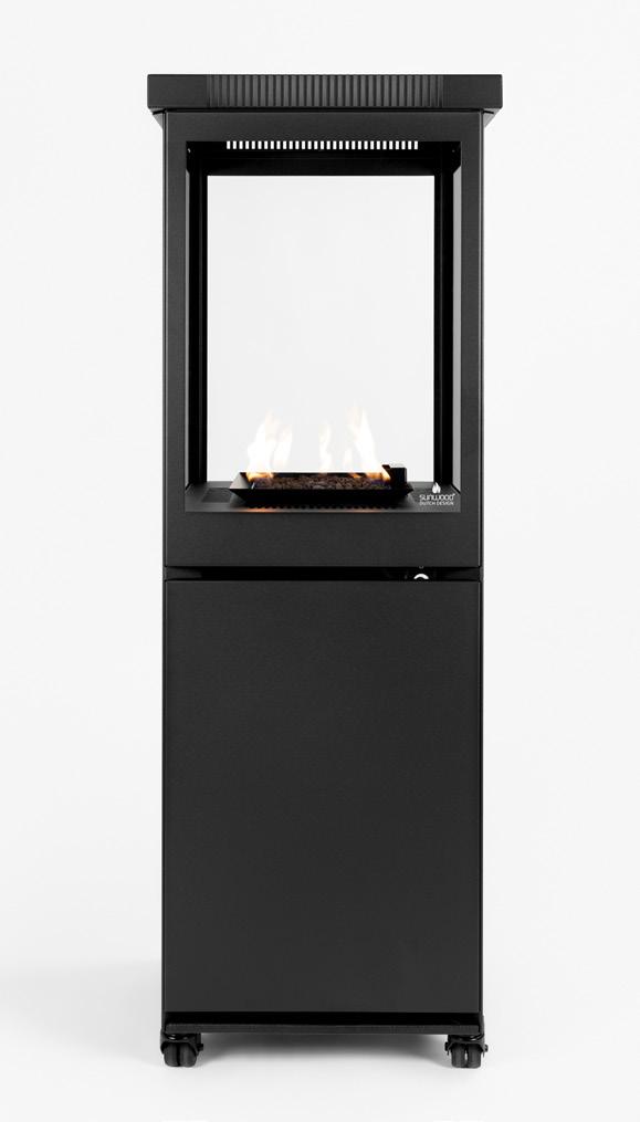 Stammen er laget av epoxy-lakkert stålplate og ildstedet er innrammet av herdet sikkerhetsglass.