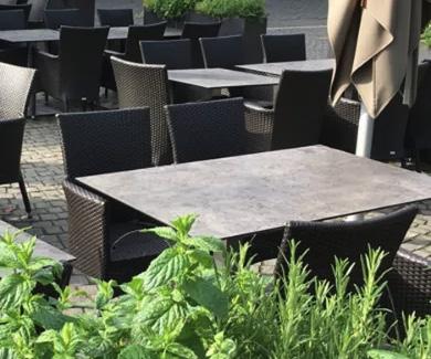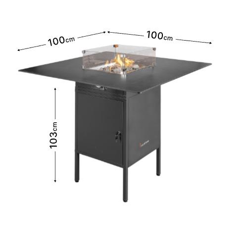 Vi lagerfører bordet i 100x100cm og har de inne i bespisningshøyde og barhøyde. Bordplaten er av hardfør kompaktlaminat