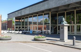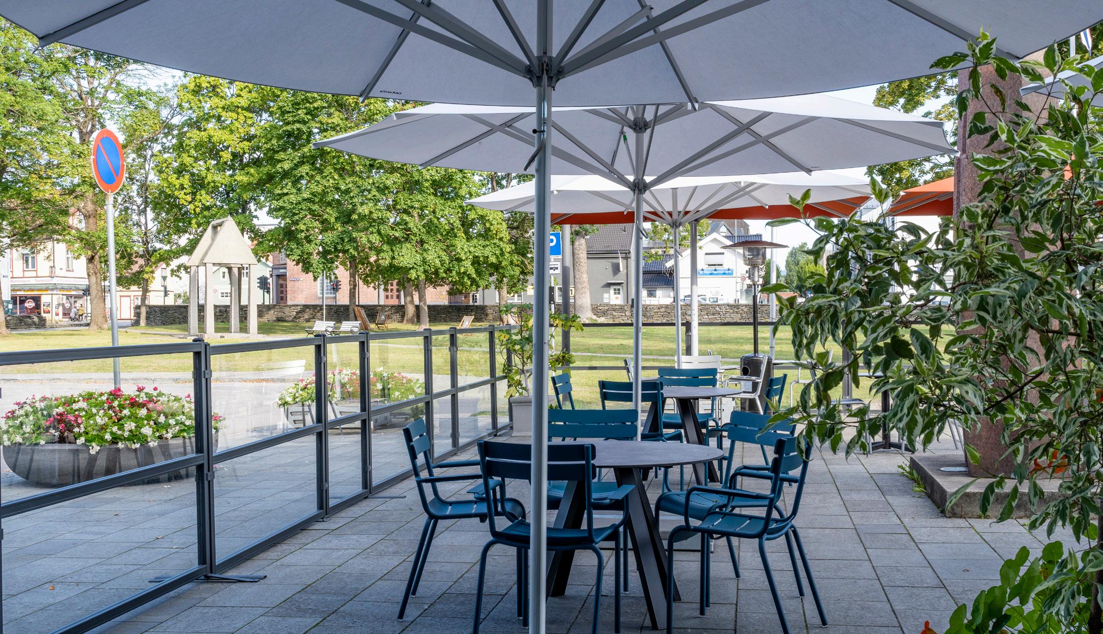 Ibsenhuset i Skien levert sommeren 2021. Uteområdet har ca 140 sitteplasser og er rammet inn i en stilig og praktisk vindskjerming i glass, store parasoller i 2 forskjellige utforminger og tekstil - og en leken blanding av møbler med farger hentet i fra bygning og en herlig blå brytning.