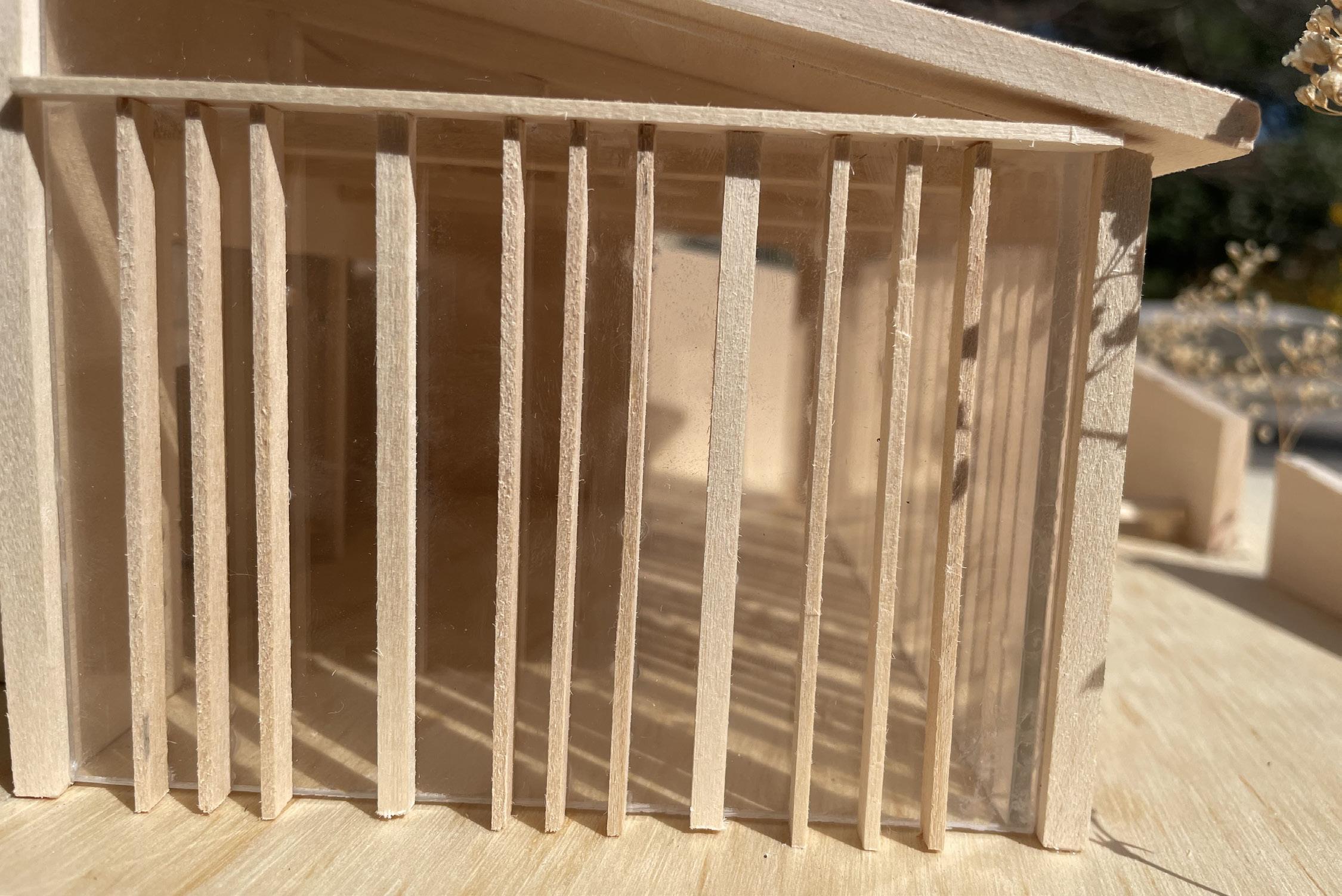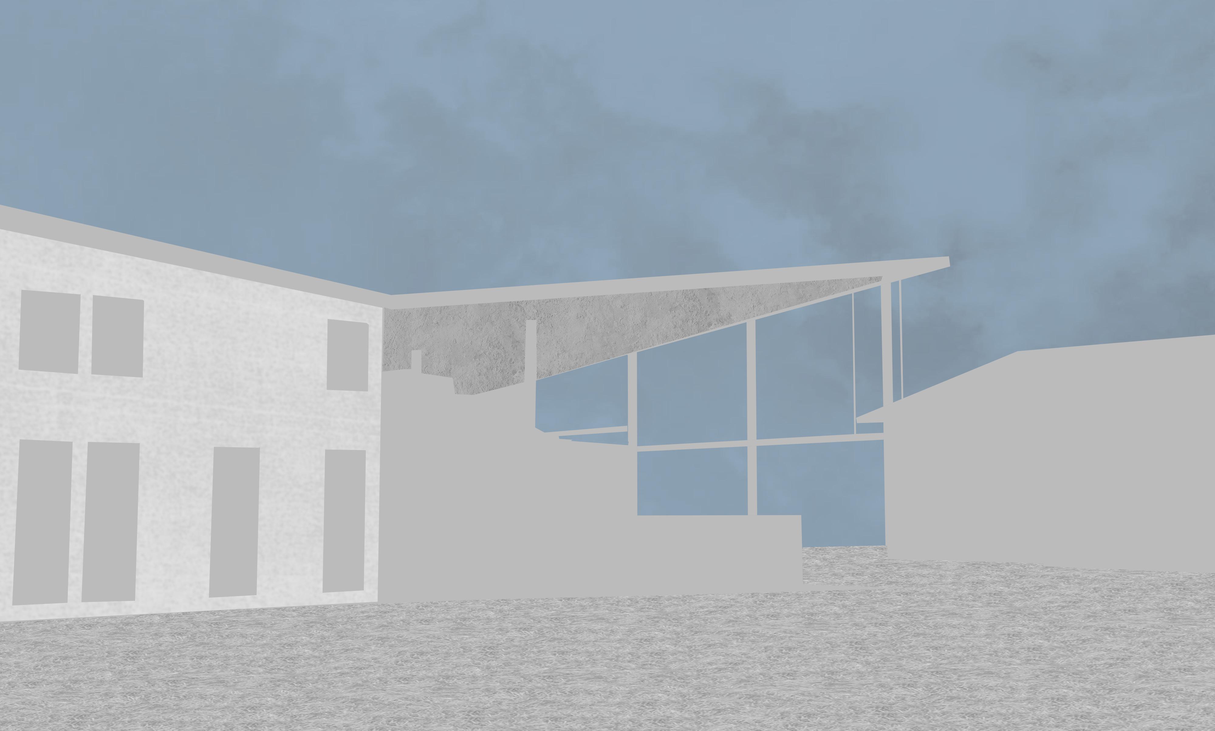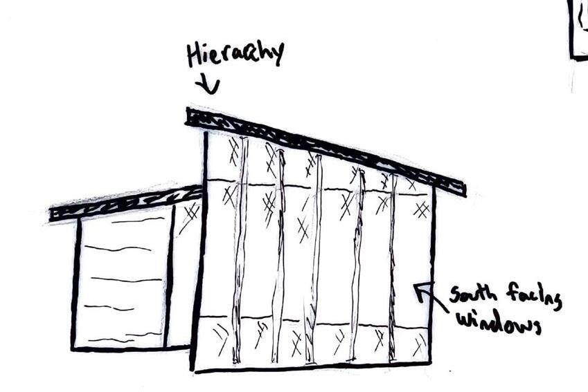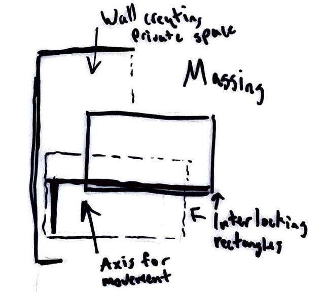 The massing of the two room functions intersects the gallery and other room functions with a central hallway that separates the 2 functions. The rectangles are then sloped for natural light and rain runoff.