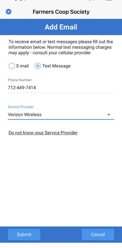B. If choosing a text message, tap the “Text Message” option. Enter the “Phone Number” and choose the “Provider” from the list and tap “Submit”.