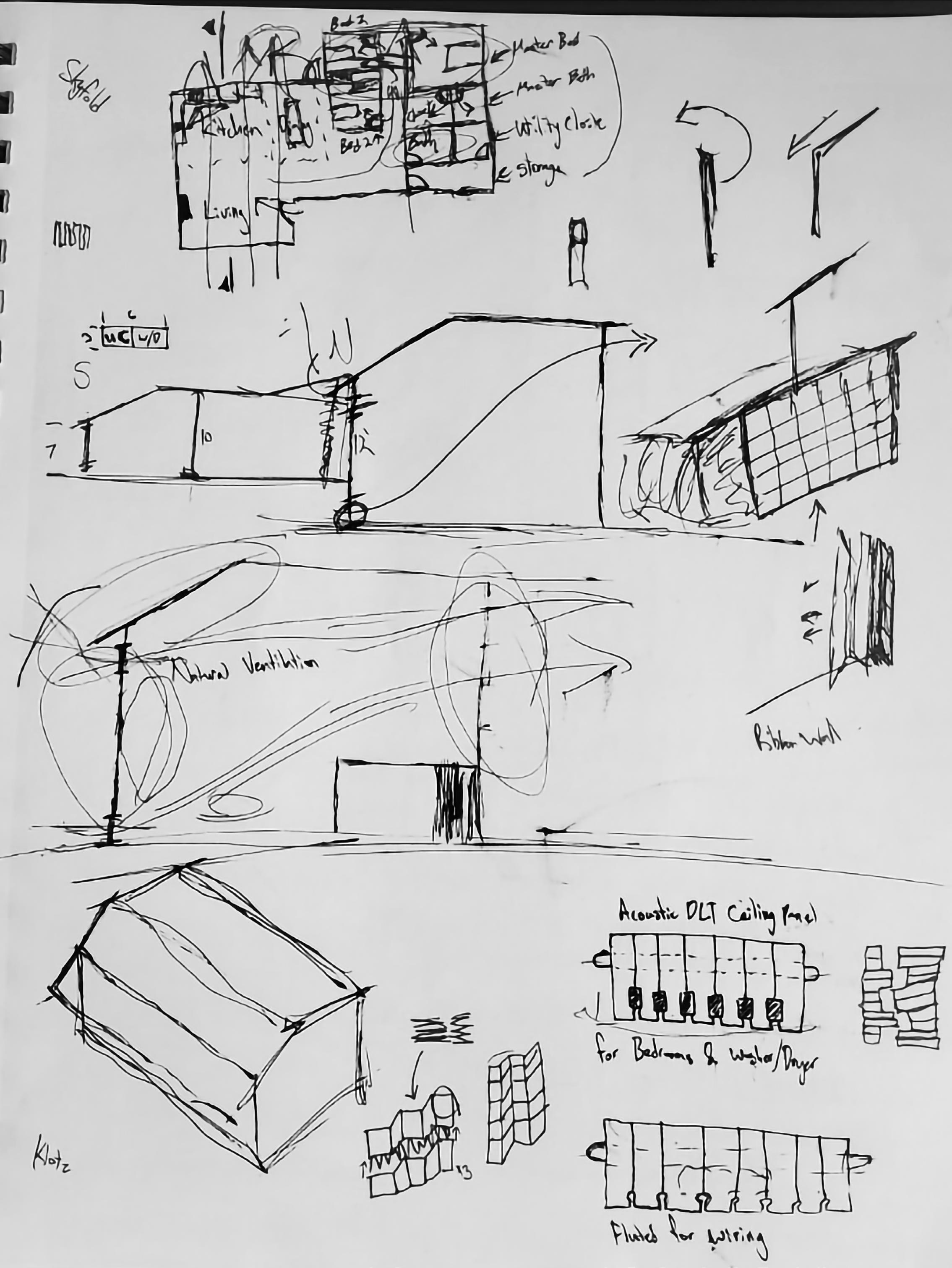 stored and shipped onto a single 8’6” x 53” x 9.6” shipping container, shipped to site, and then assembled within 3 days onsite via a contractor and construction team. The primary structure and detailing of the home relies on the integration of systems within dowel-laminated timber panels. On the product market today there are ready to manufacture strategies for inlaying electrical, plumbing, and HVAC systems into cavities machine cut in the assembly profile, while maintaining the solidity, structural capabilities, and workability of DLT as a material. Additionally high R-Value wall, floor, and ceiling assemblies are composed with the DLT acting as primary structural layer and efficient insulations and siding taking care of environmental response and protection that DLT is not solely capable of. Through and through, the Sashimono Timber House accounts for each of shipping and construction in a new way, responds to it’s unique climate region, all while maintaining a high quality of spatial and living experience for its residents.