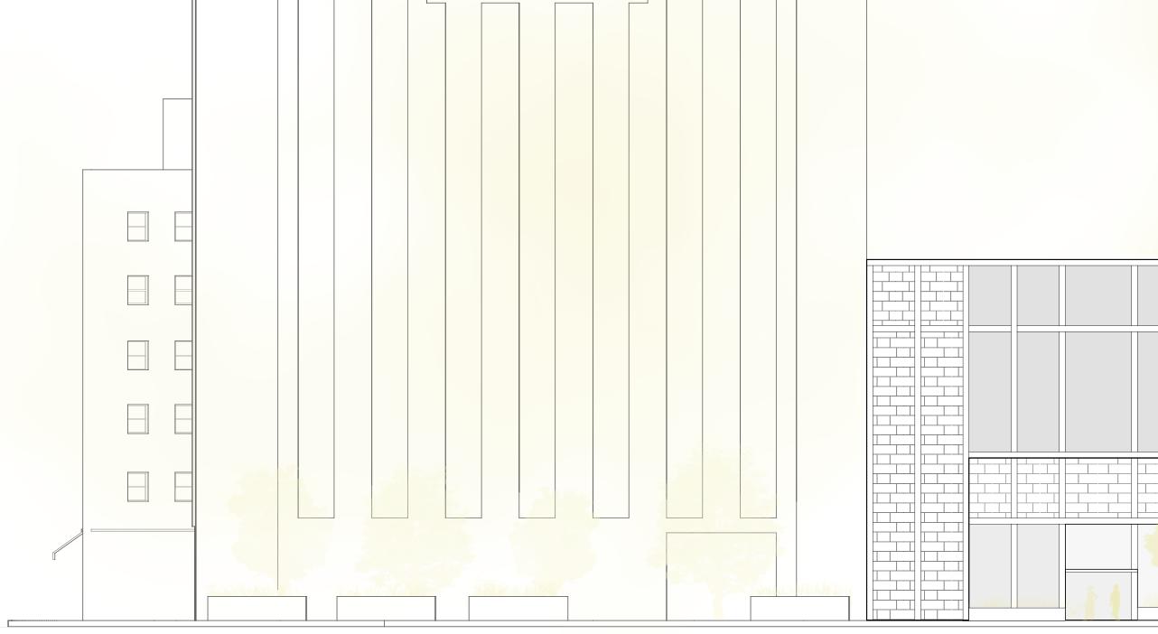 Finally, the urban plaza bring much needed greenery to area while calling back to the nearby context of the high-line through its use of integrated stone seating and walk through elements. This serves to both define gathering space as well as the major and minor entry paths into the building as mentioned above.