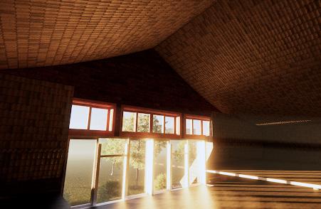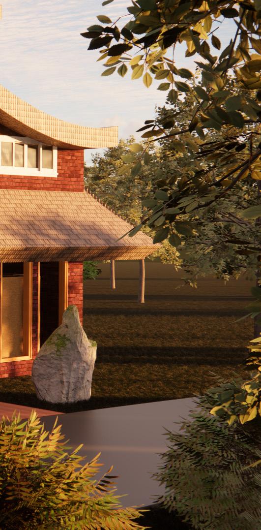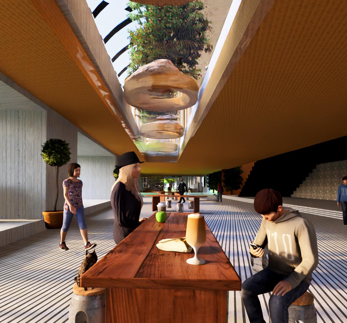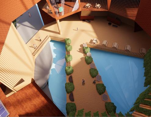 ADDITIONALLY, LARGE OPENINGS ACCESSING THE RIVER ALLOWS FOR A SENSE OF TRANQUILITY AND BALANCE AS IT CREATES A CONTRAST AGAINST THE LARGE TIMBER SRUCTURE. THE GREENRY ADDS ON TO THE ATMOPSHERE AND CREATES COHESIVNESS TO THE MAIN COURTYARD.
