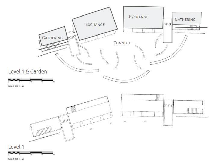 GARDEN CONNECTION. THE BUILDING OPENS UP INTO THE GARDEN, BECKONING VISITORS TO EXPLORE AND USE GARDEN SPACES FOR LEARNING AND LEISURE