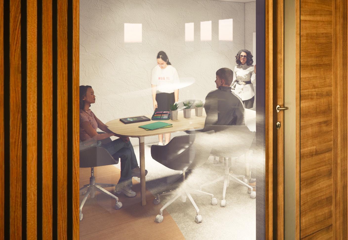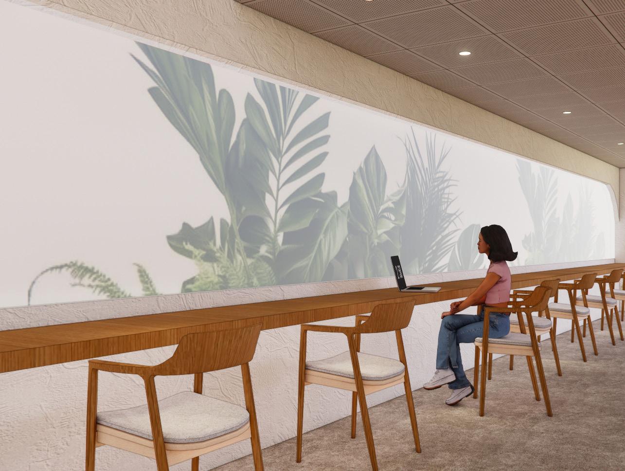 I APPROACH THE PROJECT WITH AN INTENTION OF CREATING NON CONVENTIONAL LEARNING SPACES BY LIMITING PARTITIONING WALLKS, AND DOUBLING THE VOLUME HEIGHT OF THE SPACES TO PROMOTE CREATIVE THINKING AND COLLABORATION. THE UYSE OF FLOOR TO CEILING HEIGHT WINDOWS ALLOW FOR A PANORAMIC VIEW OF THE GREEEN SPACE BELOW.
