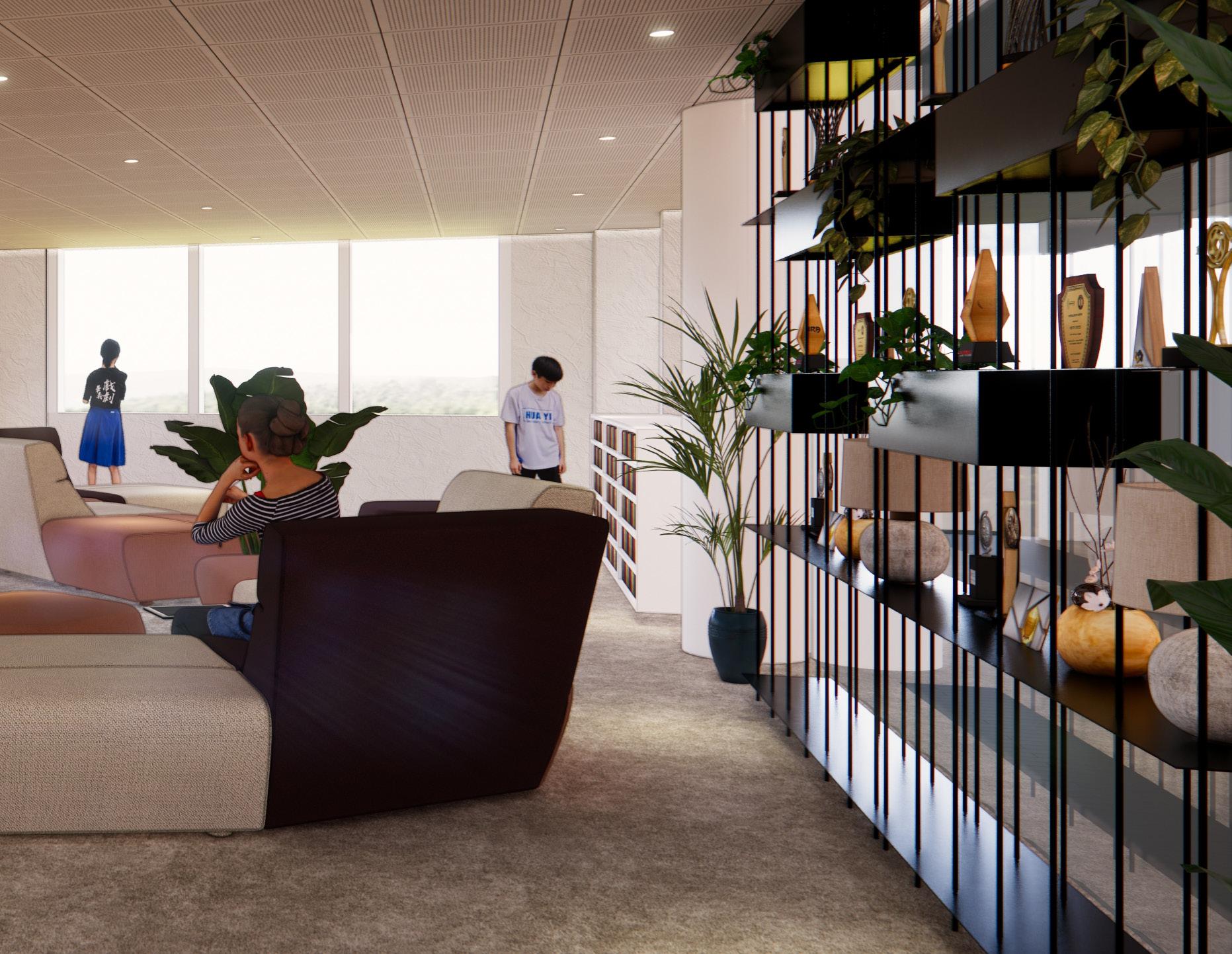 USING NATURAL MATERIALS LIKE TIMBER BRINGS NATURE CLOSER TO THE USERS, ALLOWING FOR A CONTRAST AGAINST THE ANGULAR AND GEOMETRIC SHAPE OF THE BUILDING. THIS ALLOWS FOR BALANCE AND HARMONY IN TH SPACES THAT DO NOT HAVE MUCH GREENERY.