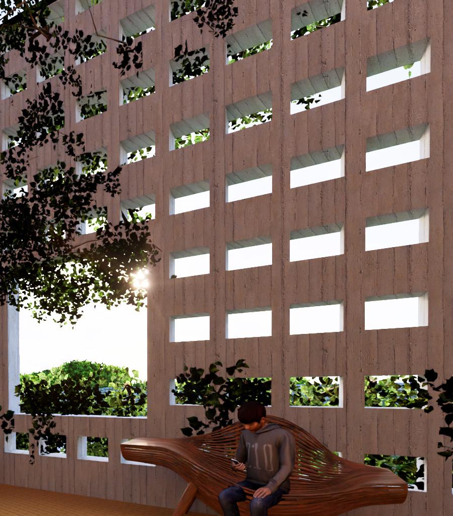 THE CURTAINS OF GREENERY ALLOW VISUAL AID AS THE BUILDING IS USED AS AN EDUCATIONAL HUB. THIS ALLOWS FOR A RELAXED ATMOSPHERE AND AS A GREEN SHIELD AGAINST THE SUN ON THE SECOND FLOOR.