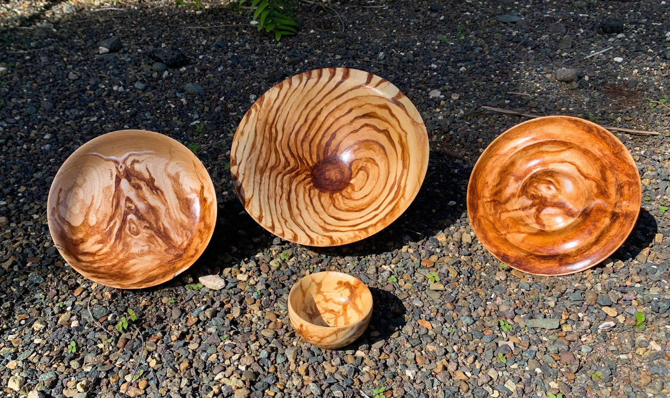A series of four bowls carefully turned and painted along the natural grain patterns brought forth by the turning process.