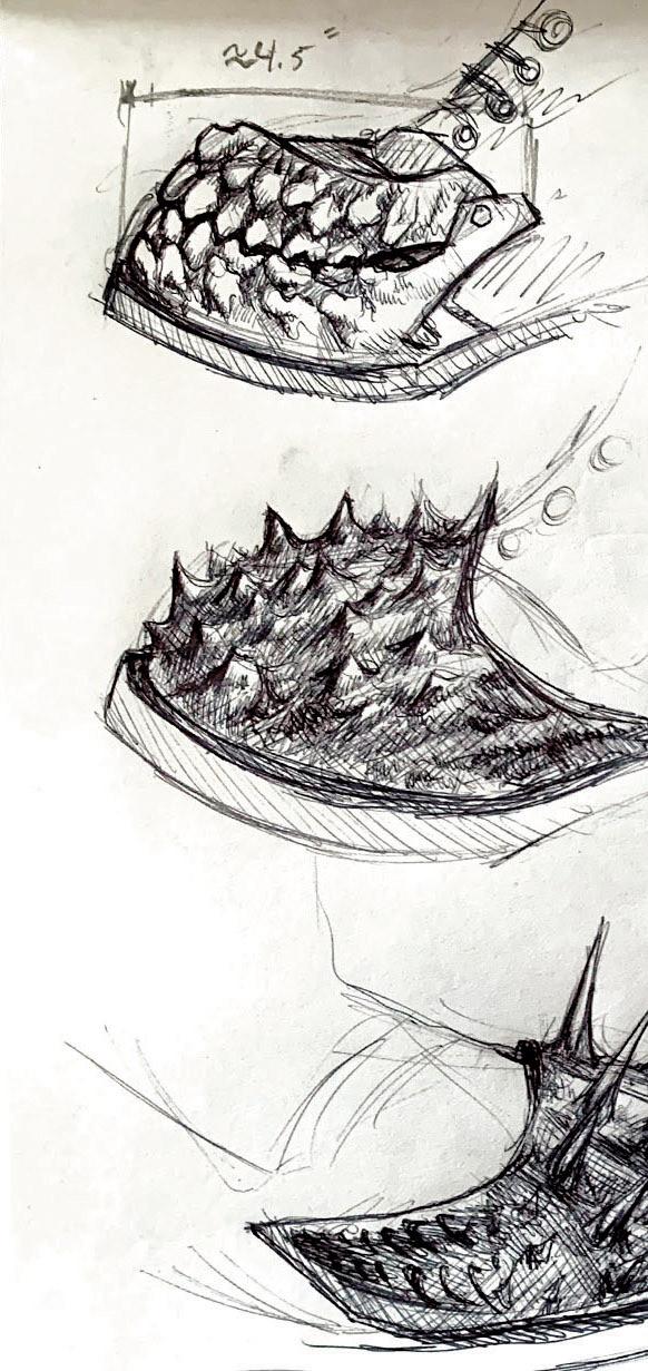 I began with a series of sketches at the conception of the idea. I then created a sketch model, then sculpted the final design out of polymer clay.