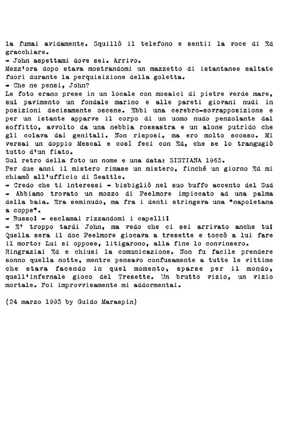 Scansata con le dita Tra le tapparelle ingiallite dell’ultima sigaretta, si scruta nello specchio, L’indice punta alla tempia Il pollice in alto Il medio preme il grilletto. Un biglietto: Dottore, la malattia di alcune vite è silenziosa, Talmente silenziosa che può non essere scoperta