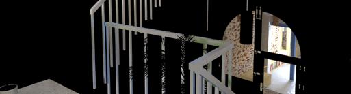 Izquierda (Izquierda - Arriba): render con postproducción del encuadre de acceso y núcleo de circulación vertical visto desde el acceso del primer nivel.