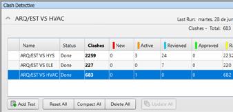 Derecha: ejemplos de procedimientos de coordinación donde se ven test de clashes, resultados, reportes, timeliner y cantidades. Navisworks Manage.