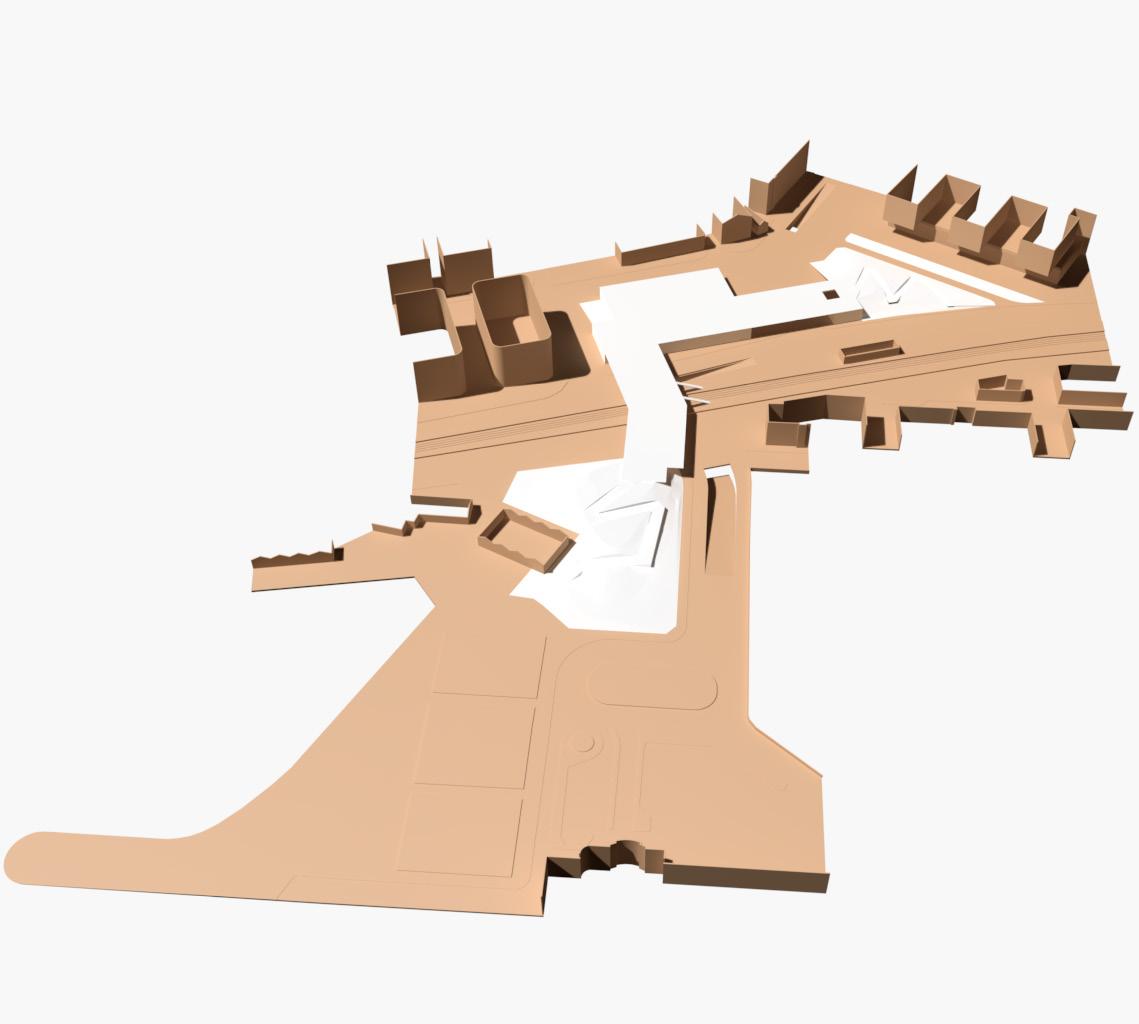 The space previously occupied by the Old Municipal Market, after demolition, is rethought and crossed by two axes of normative circulation, a Cardo and Décumano to the scale of the building, which tear the building according to the axes North/South and East/West and organize the new volumes to be built, in close dialogue with the two pre-existing facades, integrating them into the architecture.