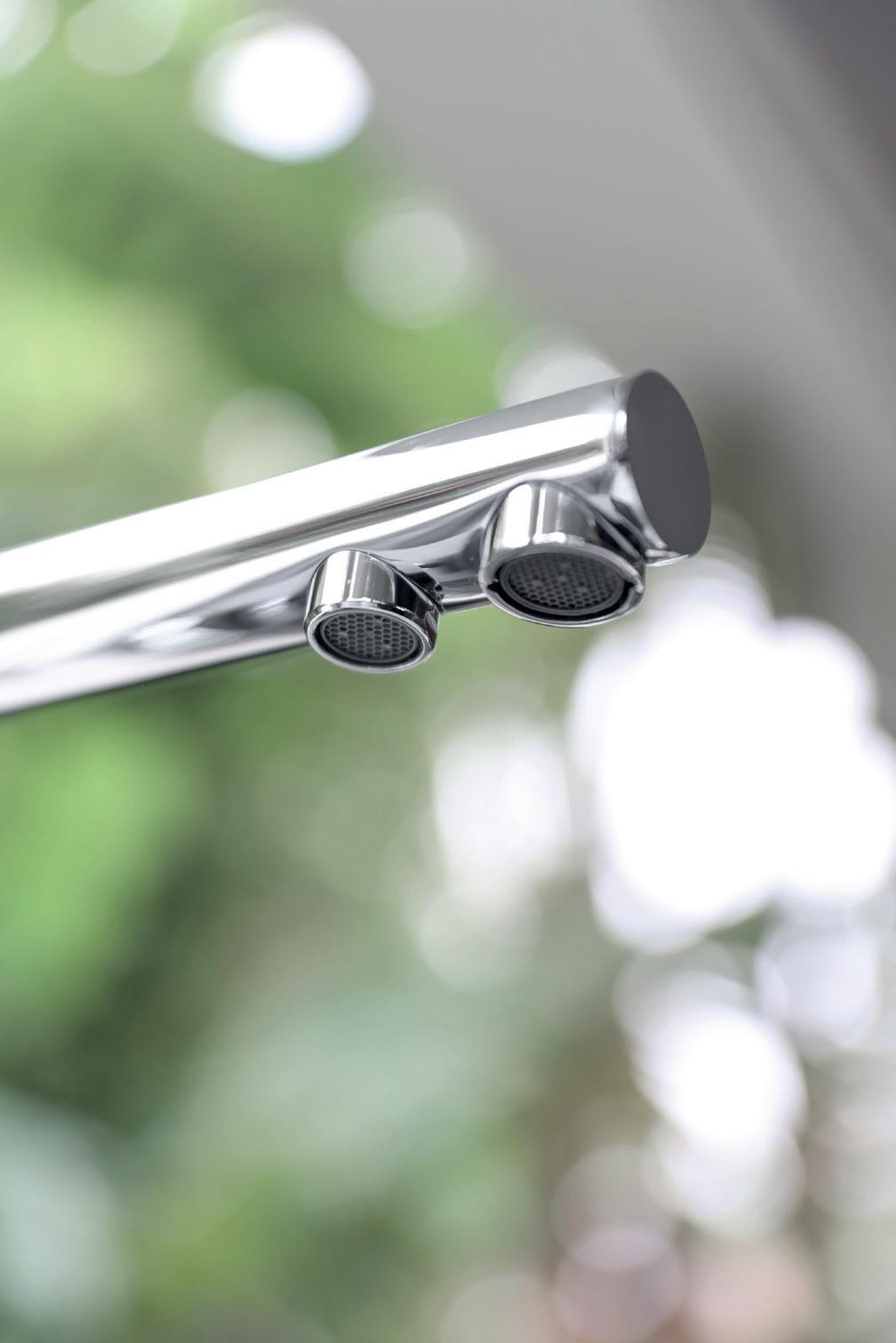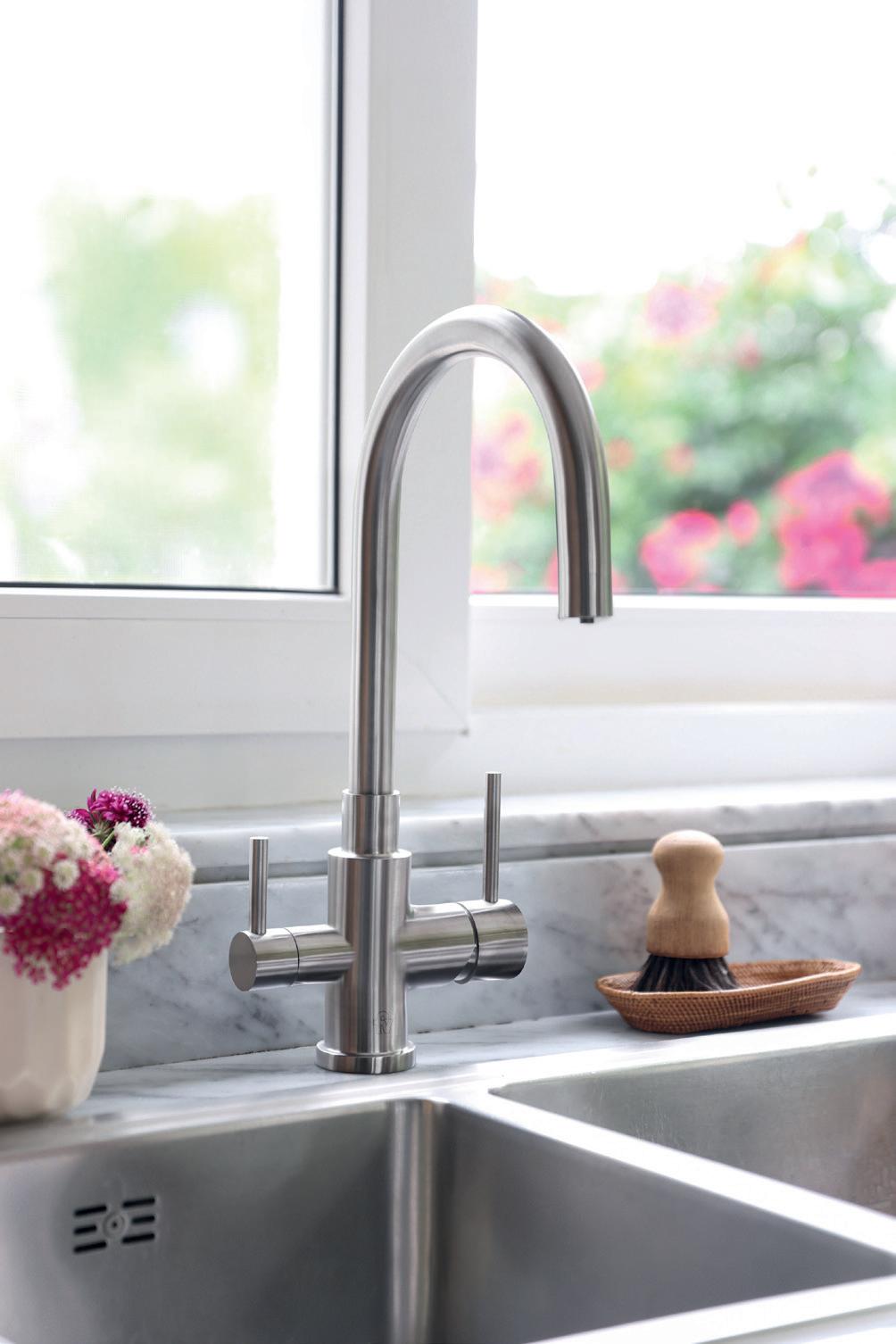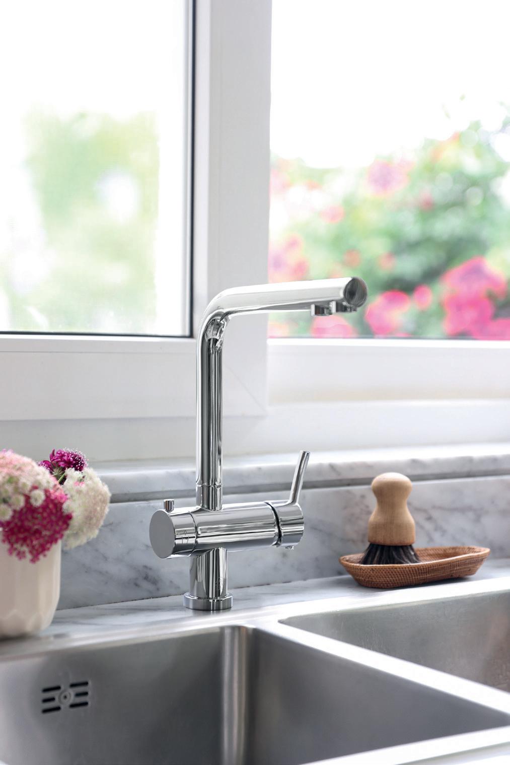 El dispositivo de acondicionamiento de agua de red domiciliaria puede conectarse a dos juegos de grifería FV de doble comando para mesada de cocina: las líneas Libby y Temple. Ambos están realizados con un sistema preparado para conectar el dispositivo y cuentan con una garantía de 5 años.