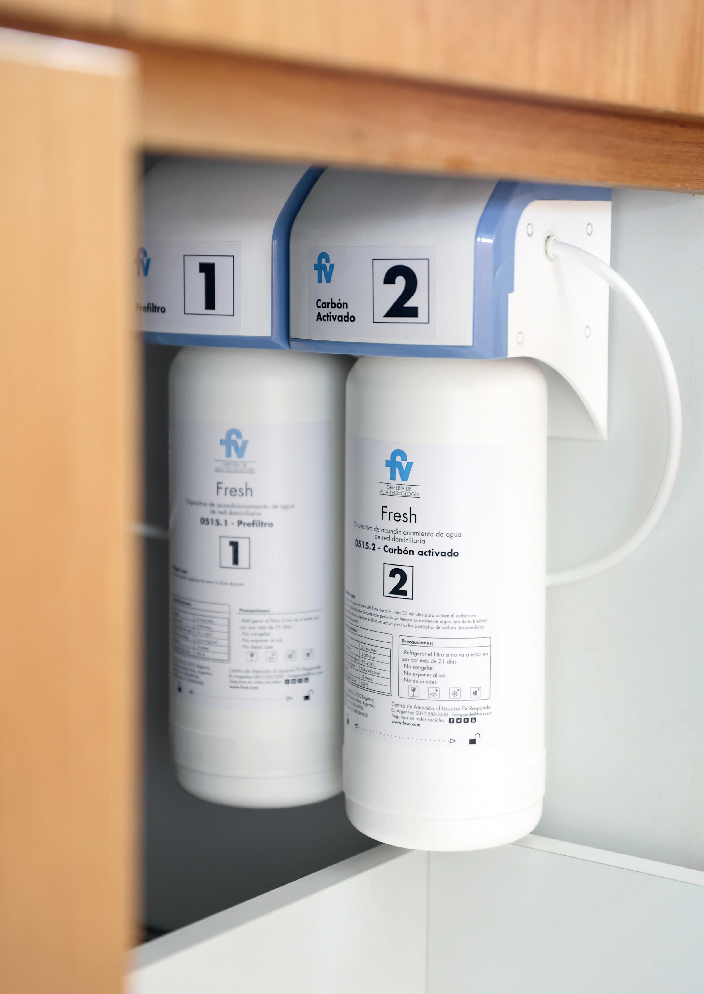 FV Fresh está compuesto por un pre filtro que retiene arena y partículas sólidas suspendidas en el agua y un filtro de carbón activado en bloque que tiene millones de poros microscópicos en donde queda atrapada Ia materia orgánica contaminante. Su función principal es remover el cloro remanente, el sabor y el olor del agua y tiene una vida útil de 5.000 litros o 12 meses desde su primer uso.