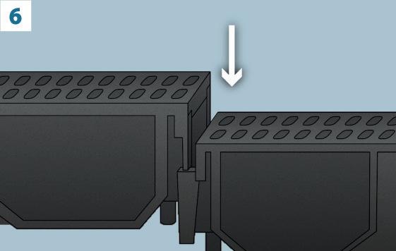 6. Los canales de piso se unen entre si encastrando el borde macho del extremo de una en el borde hembra de la otra, en forma lineal o a 90º en cualquiera de las tres salidas que tienen en ambos laterales. Estas salidas deberán recortarse porque vienen ciegas.