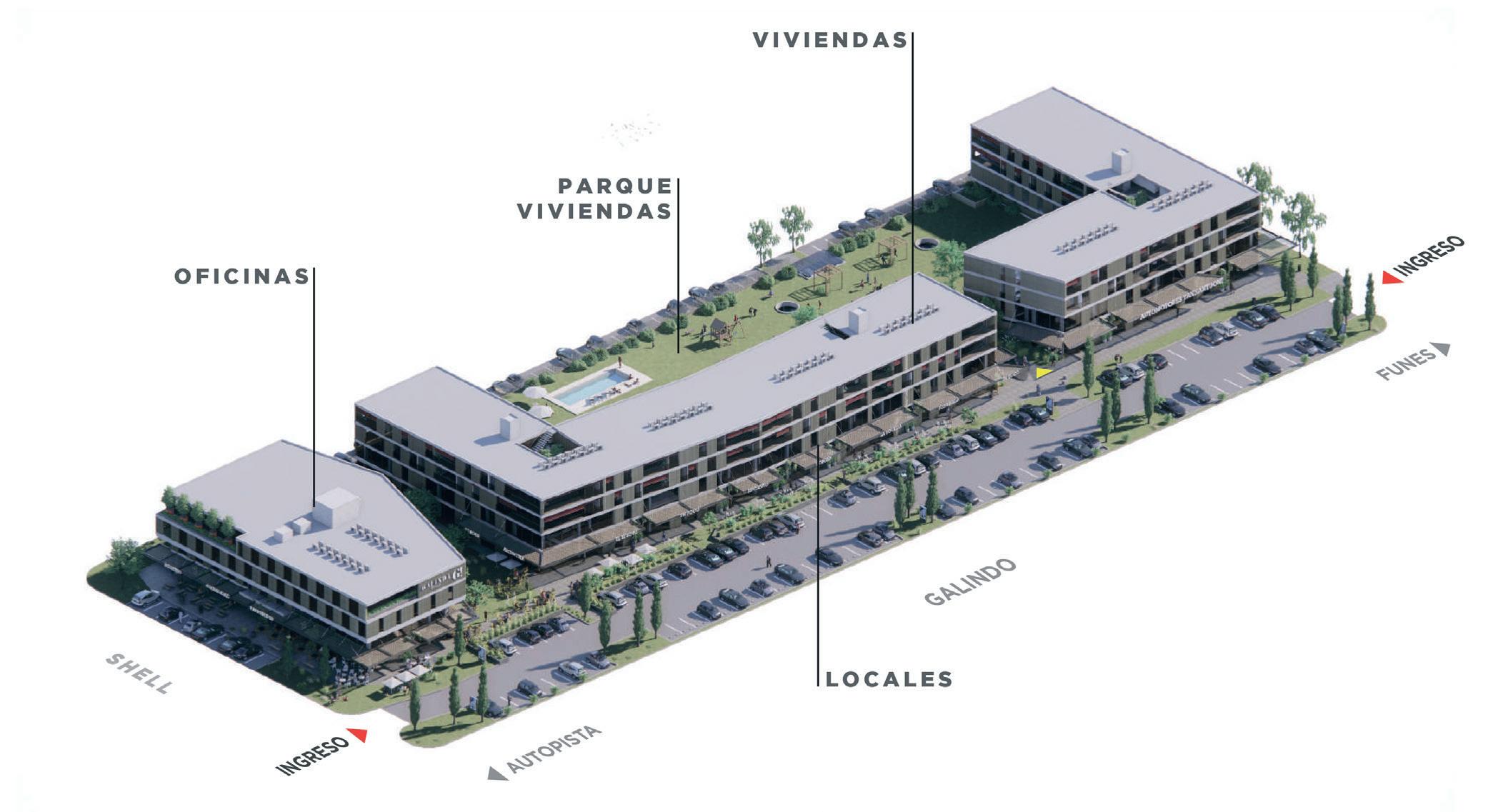 Se trata de un desarrollo de aproximadamente 13.500 m2 construidos en un terreno de alrededor de 8.800 m2, ubicado sobre calle Galindo y Picton, en la ciudad de Funes.