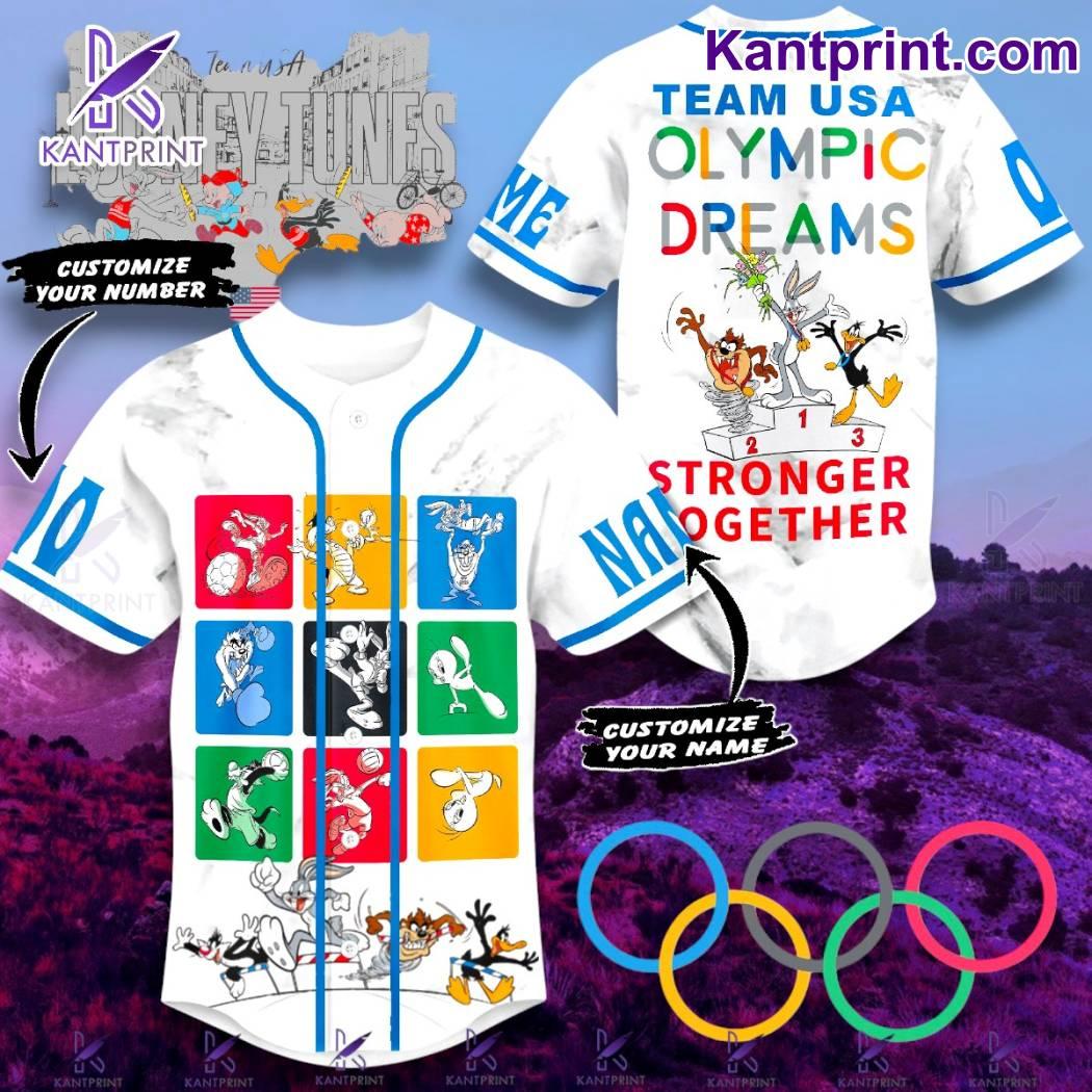 Buy Looney Tunes Olympics 2024 Jersey here: https://kantpri nt.com/store/looney-tunes-team-usa-olympic-dreams-strongertogether-personalized-baseball-jersey/