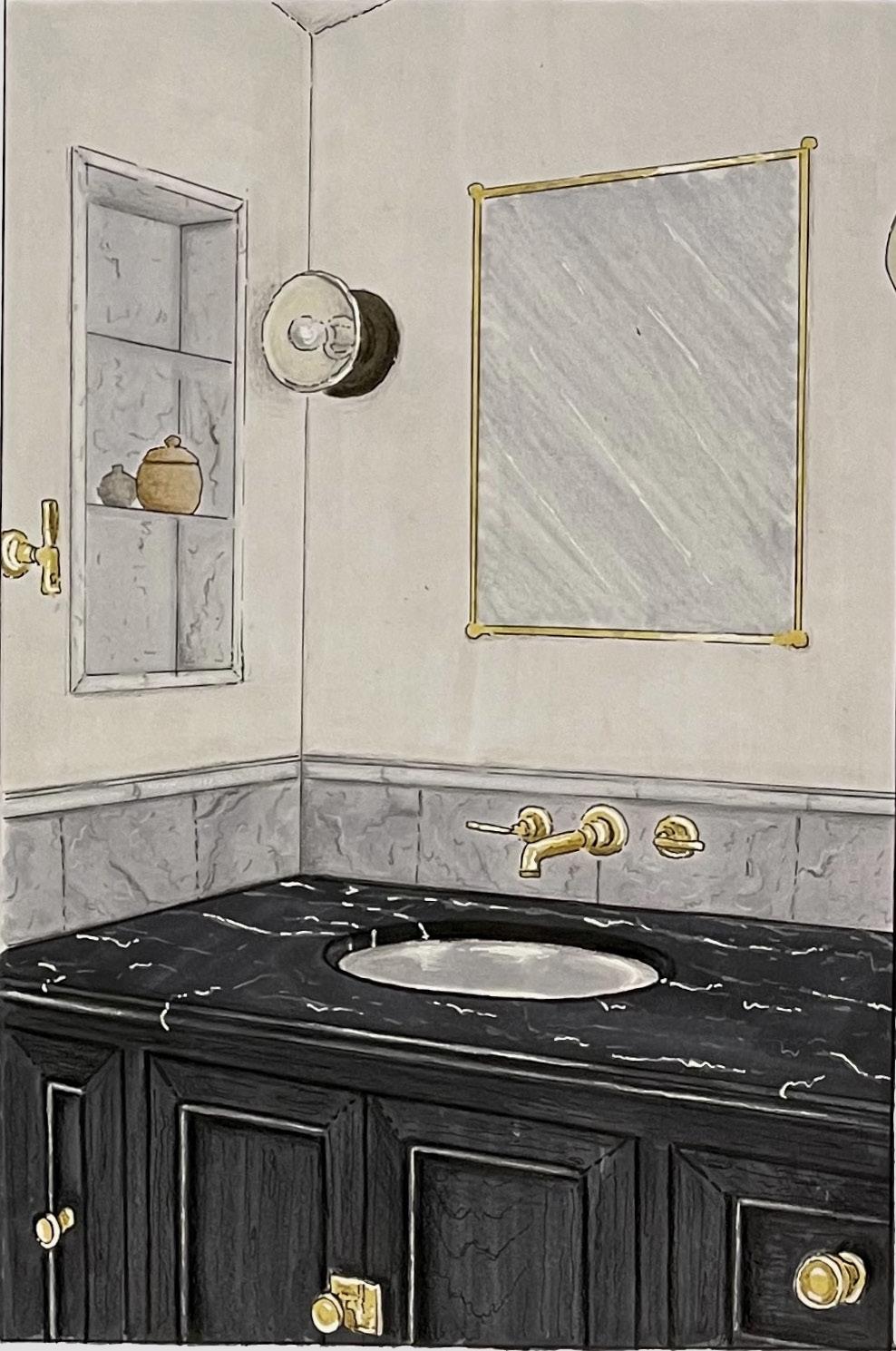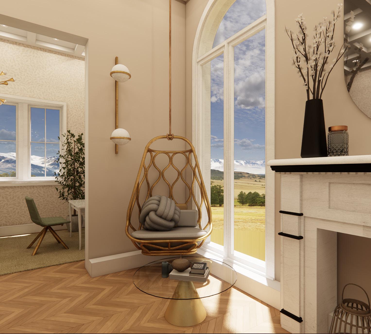 The floor plan of this modern rendition of a "boudoir" includes similar spaces that would be present during the Rococo period. One would enter the bedroom using the west doors, which includes a canopy bed, day bed/bench and relaxation nook adjacent to a fireplace. The east side of the space is devoted entirely to the boudoir, which consists of a chaise sofa and a makeup vanity. It is semi open to the bedroomvia an archway and is characterized by a largebay window on the east facade.
