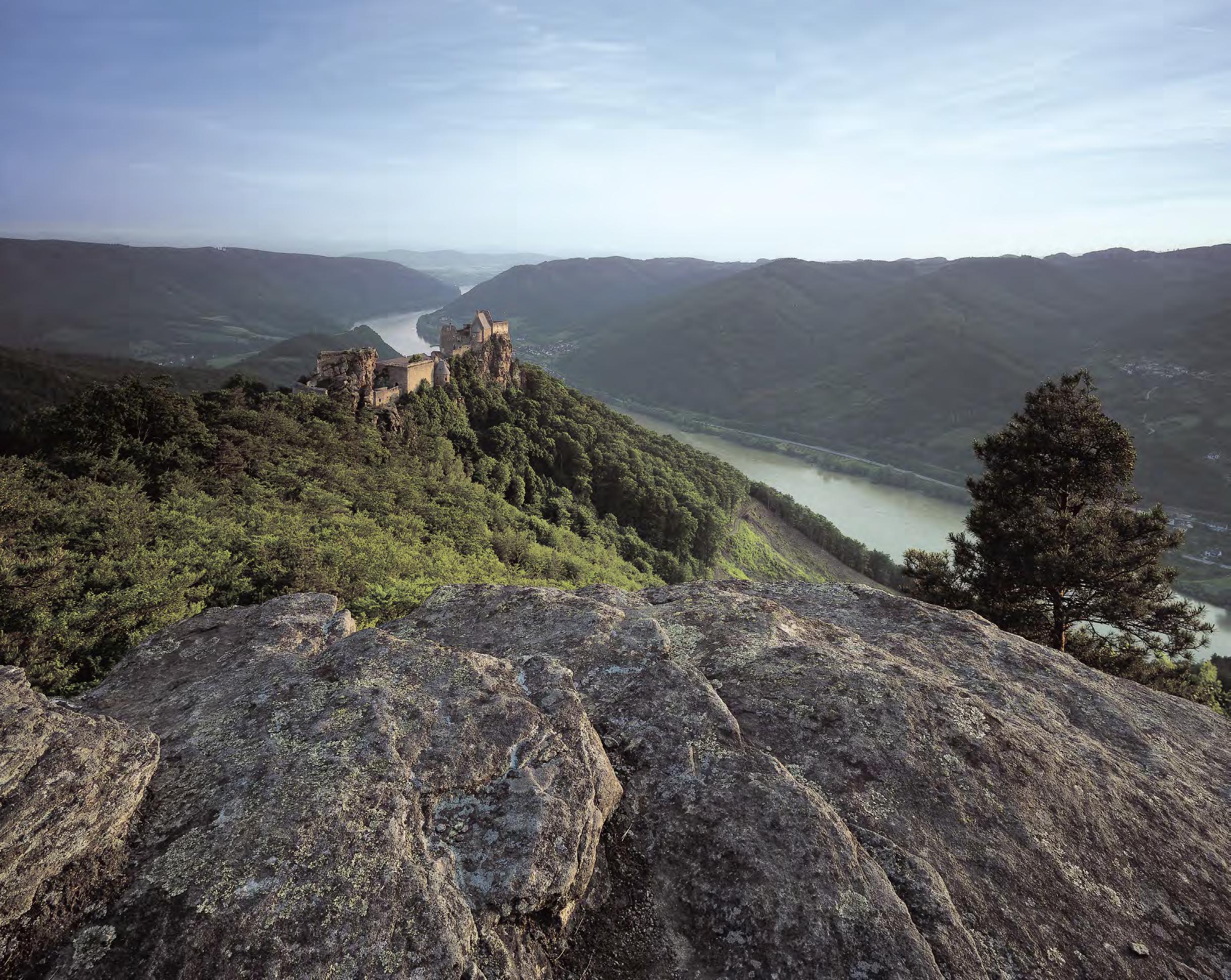 eine atemberaubende Landschaft die von Felsrippen, Burgen und bewaldeten Donauhängen geprägt wird.