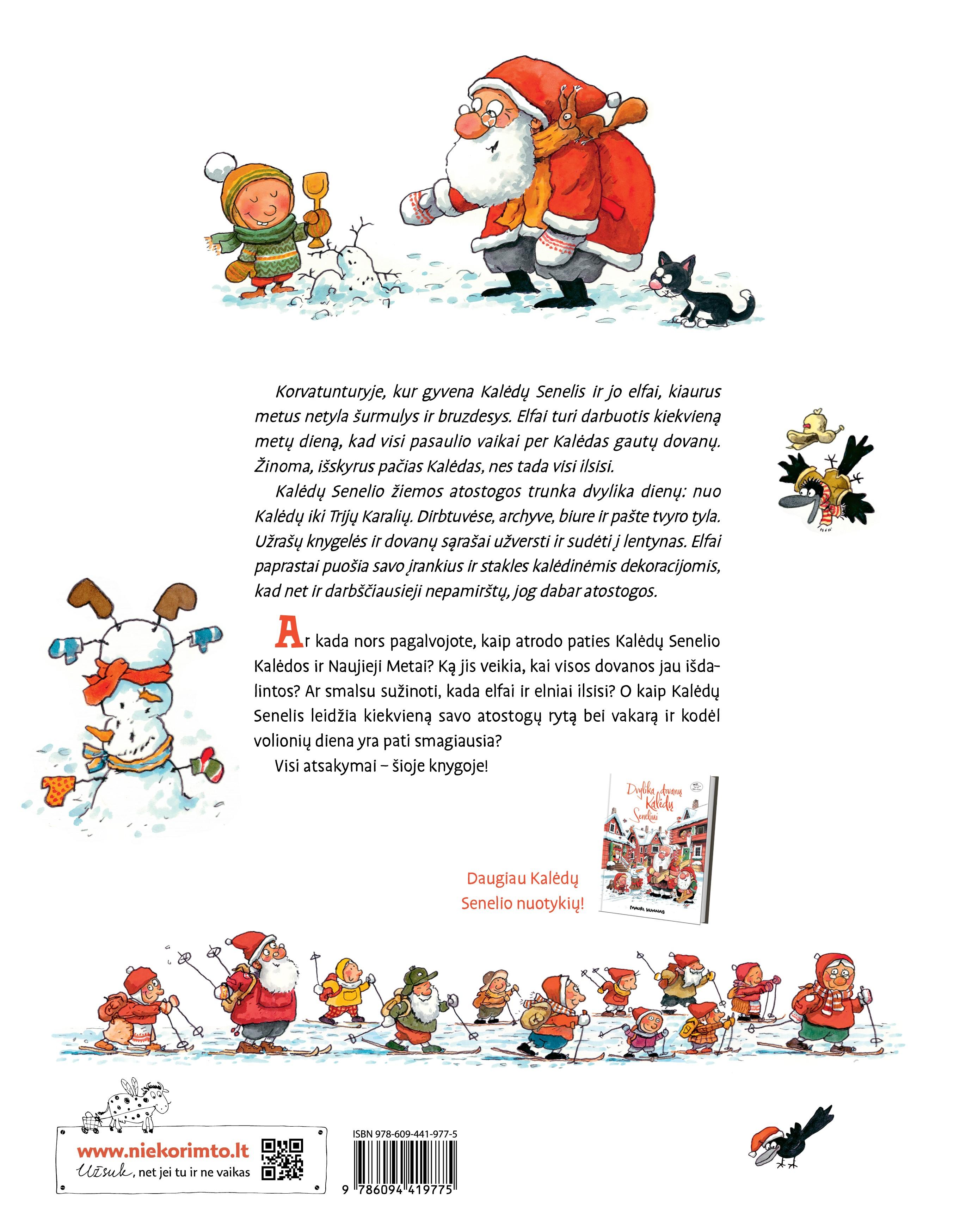 Suomių rašytojas ir dailininkas Mauri Kunnas (g. 1950 m.) ne veltui mylimas tiek savo šalyje, tiek Lietuvoje – jo paties iliustruojamos istorijos pilnos nuotykių ir netikėtumų, o kuriami personažai spinduliuoja energija, traukia neįprastumu ir žavi. Skaitydami bei vartydami šią paveikslėlių knygą mažieji skaitytojai sužinos, kaip Kalėdų Senelis, išdalinęs visiems Kalėdų dovanas, leidžia užtarnautas atostogas, kokių veiklų ir žaidimų susigalvoja drauge su elfais, kokius valgius visi drauge skanauja ir kokius pokštus vieni kitiems krečia.