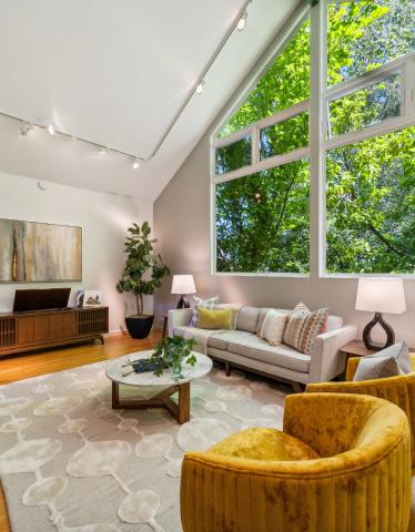 The vaulted ceilings and large windows create an open atmosphere, seamlessly connecting the home to the lush surroundings. Features include hardwood floors, slate tile in the foyer and kitchen, and Columbia Gorge Stone fireplaces. The updated Neil Kelly kitchen boasts stainless steel counters, an integrated sink, and a granite live-edge countertop. The outstanding floorplan provides excellent separation of spaces while maintaining connectivity. The primary suite features vaulted ceilings, custom closets by Portland Closet Company, and a spacious, light-filled private bath.
