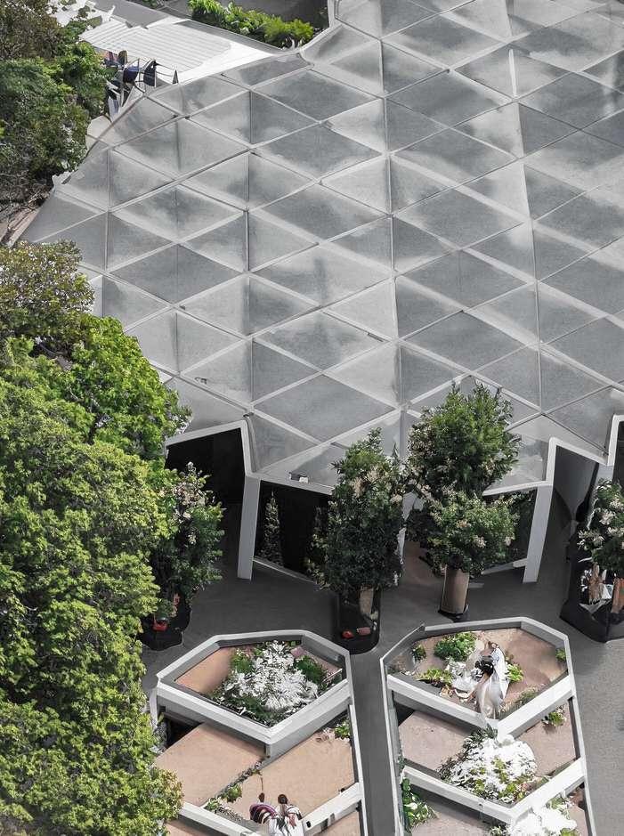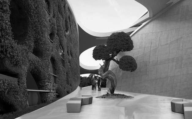 The surface of the Museum is fluid and undulating, appearing to flow and ripple like a silky ribbon. Its flexible design adapts to changes in the surrounding environment and modifies its shape to maximize natural lighting, ventilation, and energy efficiency.