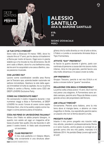 ghiera che la notte diventa un mix di arte e show, il Fabric a Londra e ovviamente Amnesia Ibiza e Tipic Formentera. ATTIVITÀ “DAY” PREFERITA? Io faccio la guerra durante il giorno, parlo con centinaia di persone a causa del mio lavoro molto intenso. Amo le mie giornate, perché faccio una vita molto dinamica e mi piace vivere la notte. APP PREFERITA? Gruppo Toscano, perché è nel mio D.N.A e mi aiuta a vincere tutte le “guerre” lavorative. RELAZIONE CON IBIZA E FORMENTERA? La prima volta a Ibiza avevo 14 anni. Da lì non ho mai perso una stagione. A Formentera sono andato sempre, perché amo Playa de Illetes e sono grande amico del proprietario dell’Amore. AMI L’ITALIA? PERCHÉ? Ovviamente. Perché sono italiano, amo la mia terra dove si mangia bene, e abiamo un mare magnifico in Sicilia, ma soprattutto perché siamo un popolo che non si ferma davanti a nulla. PROGETTI FUTURI? Intanto il mio primo progetto era riuscire nella mia attività, prendermi professionalmente Roma e ci sono riuscito, anche grazie ai consigli di un grande uomo che era mio padre, mancato il 6 febbraio 2014. Ho portato Deep Lovers agli occhi di tutti!