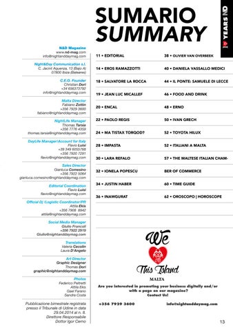 Night&Day Communication s.l. C. Jacint Aquenza, 13 (Bajo A) 07800 Ibiza (Baleares) C.E.O. Founder Christian Dori +34 656373792 info@nightanddaymag.com Malta Director Fabiano Zottin +356 7929 3600 fabiano@nightanddaymag.com NightLife Manager Thomas Tarsia +356 7776 4359 thomas.tarsia@nightanddaymag.com DayLife Manager/Account for Italy Flavio Luisi +39 349 6055768 +356 7920 7291 flavio@nightanddaymag.com Sales Director Gianluca Comesino +356 7922 5064 gianluca.comesino@nightanddaymag.com Editorial Coordination Flavio Luisi flavio@nightanddaymag.com Official Dj /Logistic Coordinator/PR Attila Ekis +356 7908 8942 attila@nightanddaymag.com