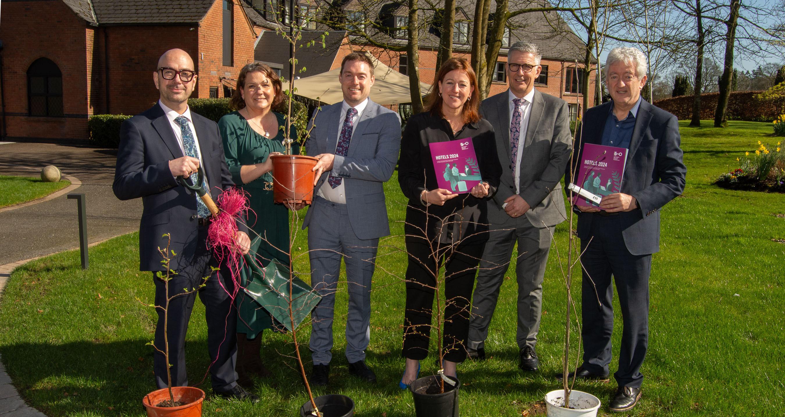L-R Gerardo Larios Rizo, Head of Hospitality, Bank of Ireland; Sian Young, Director of Sustainable Business, Britvic Ireland; Eddie McKeever, President of Northern Ireland Hotels Federation (NIHF); Julie Wakley, Head of GB, Tourism Ireland; Mark Simpson, Business Outlook Compere and John McGrillen, CEO, Tourism Northern Ireland. As part of their commitment to sustainability, native Irish trees were planted onsite, a symbol of their dedication to offset carbon emissions, supported by Bank of Ireland.