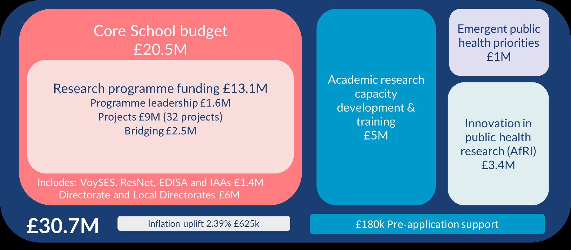 The School was awarded £29.9M from 2022–2027, allocated to activity as shown below. We have since been awarded an inflationary uplift of 2.39% (£652k) and funding for pre-application support awards (£180k) bringing total award for SPHR to £30.7M (with an additional £10M for Prevention Research Programme bringing total to £40.7M).
