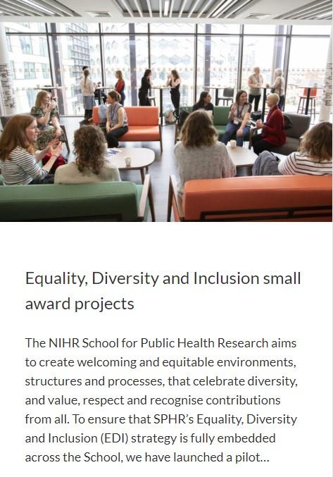 We have commissioned a pilot for EDI Small Awards aimed at supporting elements within the strategy. The first round led to four successful awards, including projects to support accessible and inclusive meetings, consolidation of NIHR EDI strategies, and promoting equity in underrepresented groups. These topics span many of the strategy pillars.