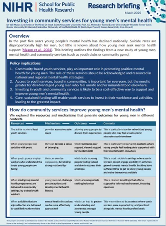 The Public mental health programme aims to identify ways to reduce mental health inequalities across the life course by exploring how the settings in which people live, learn and work can support good mental health and wellbeing. The programme has three inter-linked workstreams: WS1: harnessing community assets to improve mental health and reduce inequalities; WS2: strengthening systems to support groups at risk of poor mental health and WS3: supporting mental health through schools and families.
