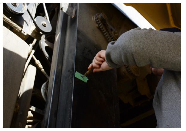 3. Testare i sensori ottici. Con la mietitrebbia accesa (non è necessario che il motore sia in funzione), recarsi all'elevatore per cereali puliti e far girare manualmente l'azionamento della trebbiatrice. Quando le pale vuote passano davanti ai sensori ottici, il sensore con le luci LED lampeggia. Se il lampeggiamento avviene, i sensori ottici sono accesi correttamente e allineati.