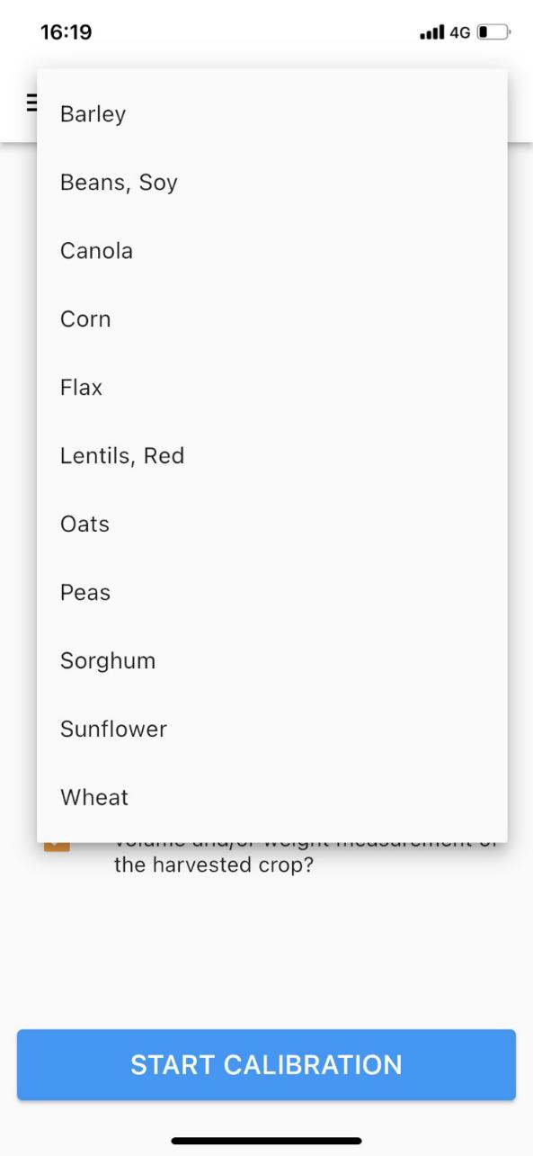 1. Selezionare la coltura da calibrare premendo sulla coltura corrente; dovrebbe apparire un elenco di colture, premere sulla coltura desiderata.