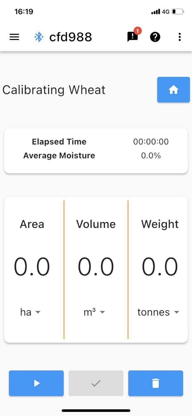 Una volta premuto, lo stato dell'esecuzione della calibrazione viene salvato, consentendo all'utente di navigare altrove nell'applicazione in attesa dei valori di calibrazione del volume/peso. È fondamentale che l'utente NON prema l'icona quando torna alla schermata Calibrazione del raccolto per immettere i valori di calibrazione, poiché in questo modo i valori salvati vengono cancellati. Al termine della calibrazione, il valore di calibrazione può essere applicato al raccolto precedente.