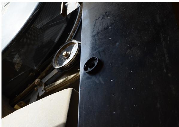 La posizione di installazione sullo sportello inferiore è importante, ma varia in parte da mietitrebbia a mietitrebbia. L'importante è installarlo vicino al punto in cui la granella esce dalla coclea trasversale e vicino al punto più basso dello sportello, appena prima del punto in cui è visibile un'usura significativa dovuta al flusso della granella.